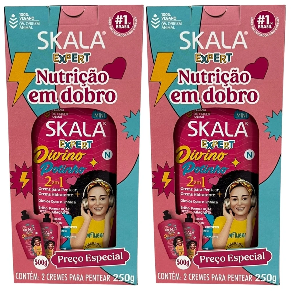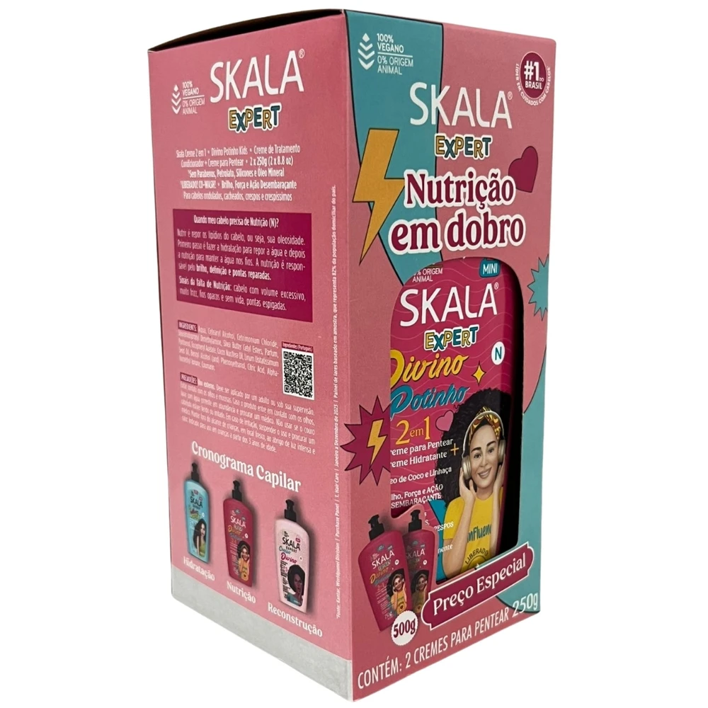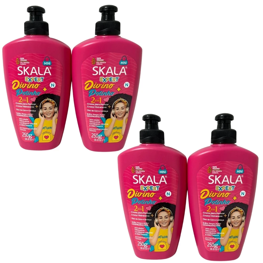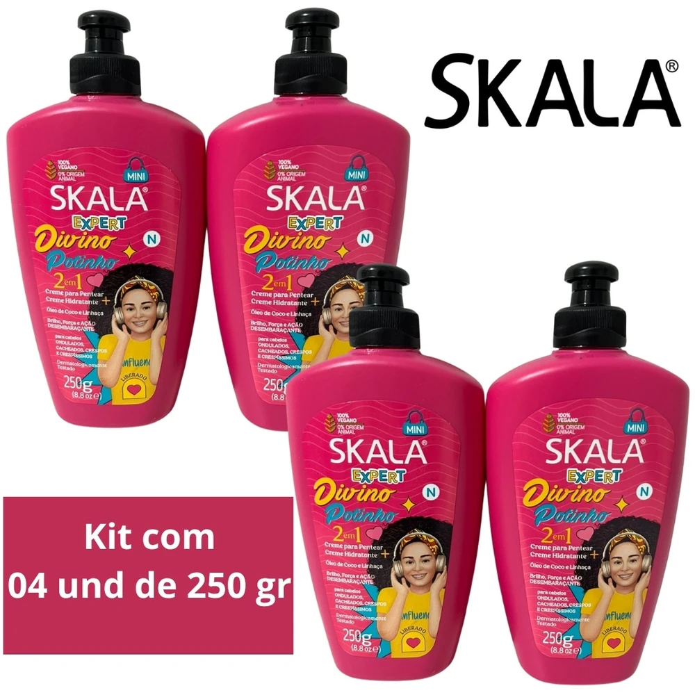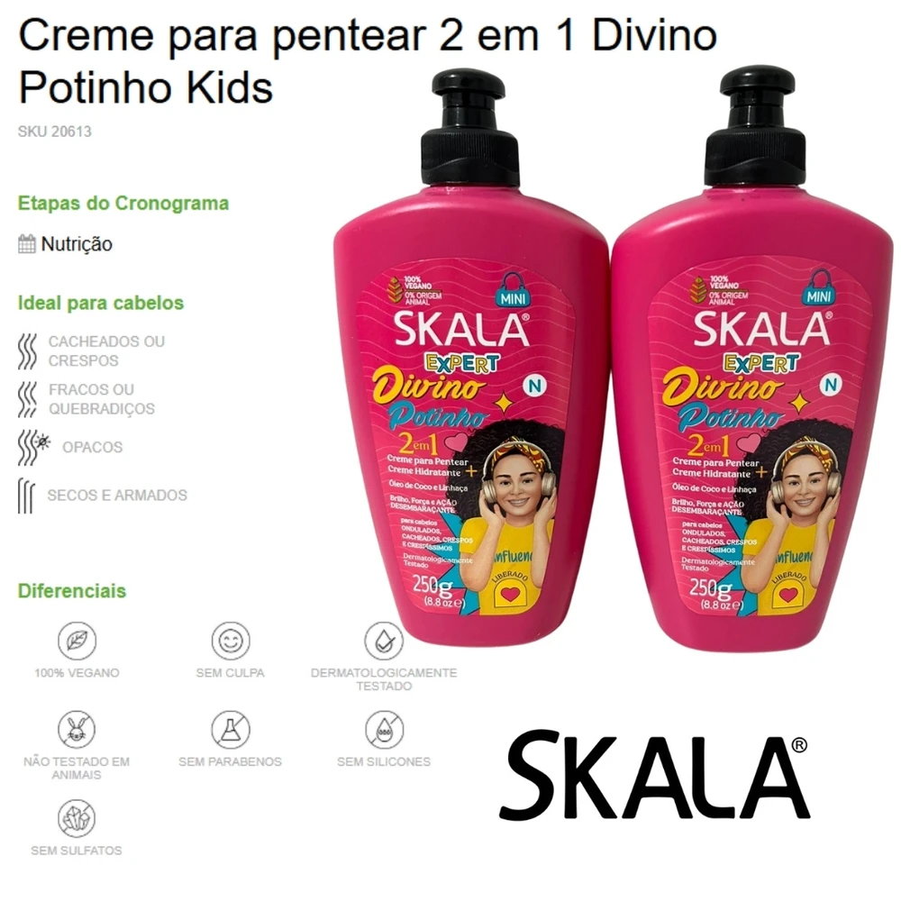 A linha Skala Expert Divino Potinho foi desenvolvida para facilitar a rotina de cuidados com cabelos das crianças cacheadas e crespas principalmente na hora do desembaraço. E o melhor de tudo está por vir: pode ser utilizado como Creme de Tratamento e Creme para Pentear. É só passar e deixar o dia todo. Ele elimina o frizz, nutre, dá vida aos fios opacos, volume na medida certa e modela os cachos de maneira suave sem deixar resíduos. A linha Skala Expert Divino Potinho é indicada para crianças acima dos 3 anos.