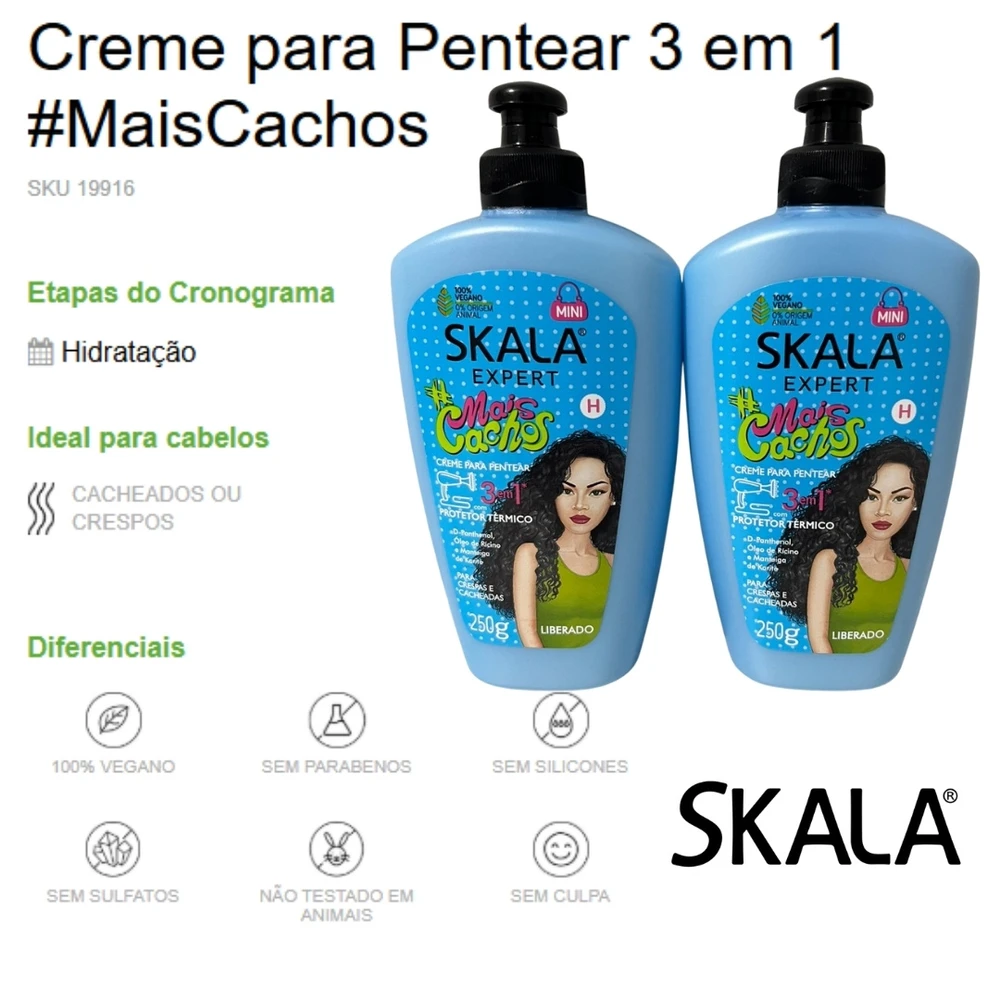 A linha Skala Expert #Mais Cachos foi desenvolvida especialmente para atender as necessidades dos cabelos cacheados, crespos, crespíssimos ou em transição. Com ingredientes em nutrientes que hidratam e desembaraçam, ela dá brilho, força e ultra reparação, além de deixar os cachos ostentando aquele volumão.