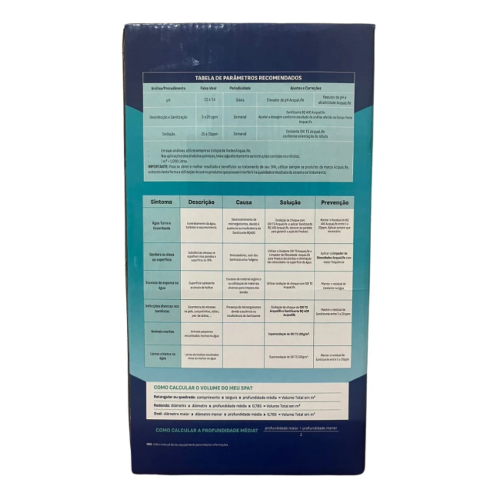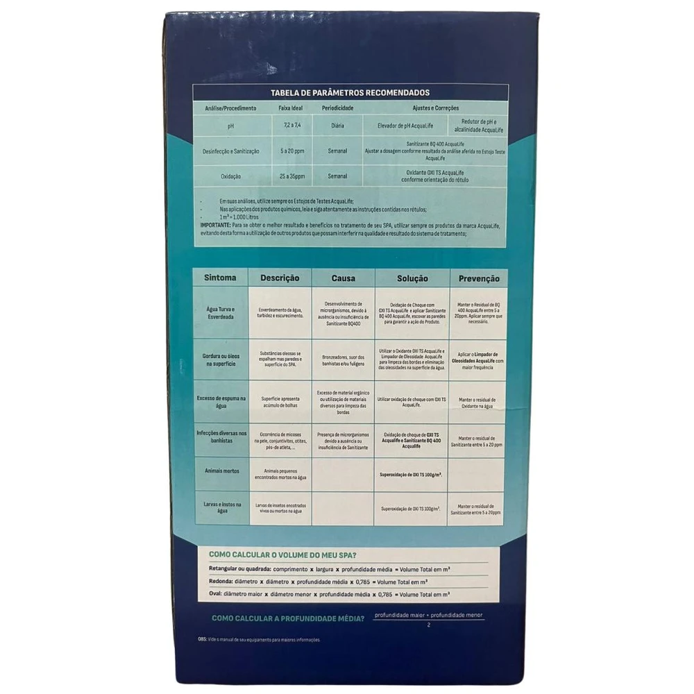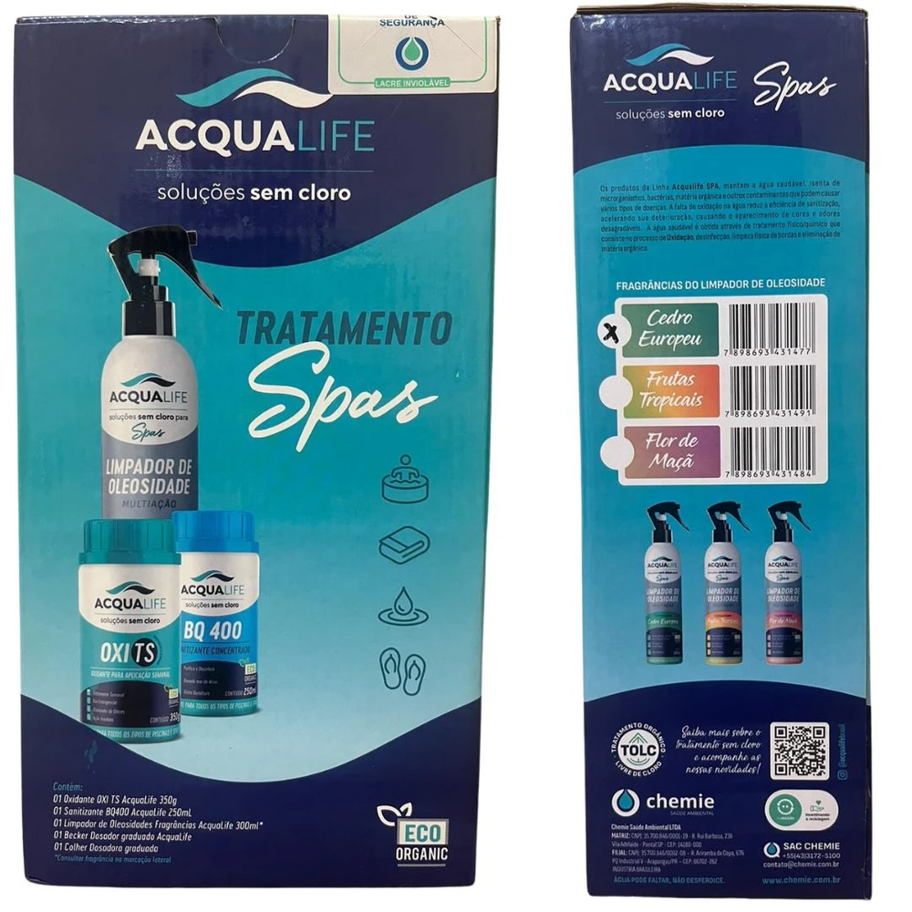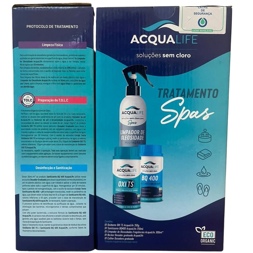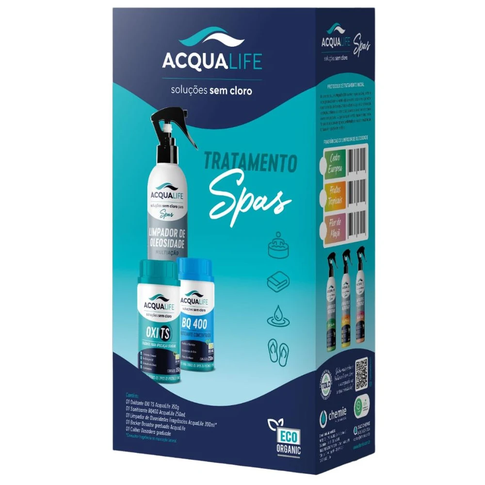 Descrição? NOME DO PRODUTO: TRATAMENTO SPA ACQUALIFE.? VERSÕES: CAIXA DE EMBARQUE 4X1KIT.? COMPOSIÇÃO:1 OXIDANTE OXI TS 350G1 SANITIZANTE BQ 400 250ML1 LIMPADOR DE OLEOSIDADE FRAGÂNCIAS 300ML*1 BEQUER DOSADOR GRADUADO1 COLHER DOSADORA GRADUADA? PARE DE JOGAR ÁGUA FORA!? Evite o desperdício utilizando TRATAMENTO SPA Fragrâncias, que foiespecialmente desenvolvido para um tratamento completo e efetivo da água desua banheira ou spa, além de possuir óleos essenciais em sua fórmula, deixandoum aroma suave e agradável no ambiente. TRATAMENTO SPA Fragrâncias trataaté 8.000 mil litros de água por 30dias.? O Kit possui a combinação perfeita de produtos para LIMPEZA FÍSICA,OXIDAÇÃO E DESINFECÇÃO d?agua, sem afetar/deteriorar equipamentos,estruturas e principalmente a segurança do cliente em sua manipulação.