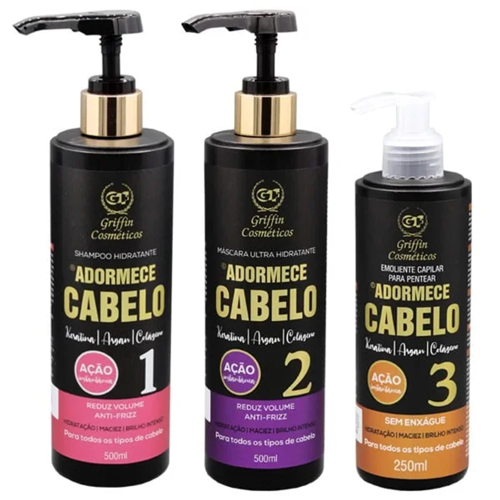 Descubra o KIT ADORMECE CABELO Griffin, composto por 3 peças essenciais para transformar seus cabelos: shampoo, máscara ultra hidratante e emoliente para pentear. Com fórmula poderosa enriquecida com queratina, óleo de argan e colágeno, este kit reduz o volume e o frizz, proporcionando hidratação profunda, maciez e brilho intenso. Ideal para todos os tipos de cabelo, oferece resultado profissional que alinha fios rebeldes e devolve a saúde dos cabelos danificados.