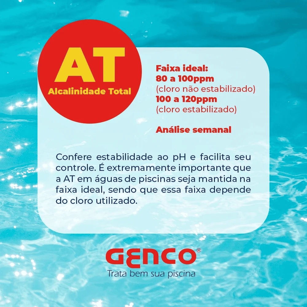 Produto em grânulos para repor a alcalinidade total da água e assim estabilizar o pH. Indicado para todo tipo de piscinas especialmente as que utilizam o GENCLOR® Cloro Estabilizado GENCO®, pois este produto consome a alcalinidade da água produzindo abaixamento do pH.