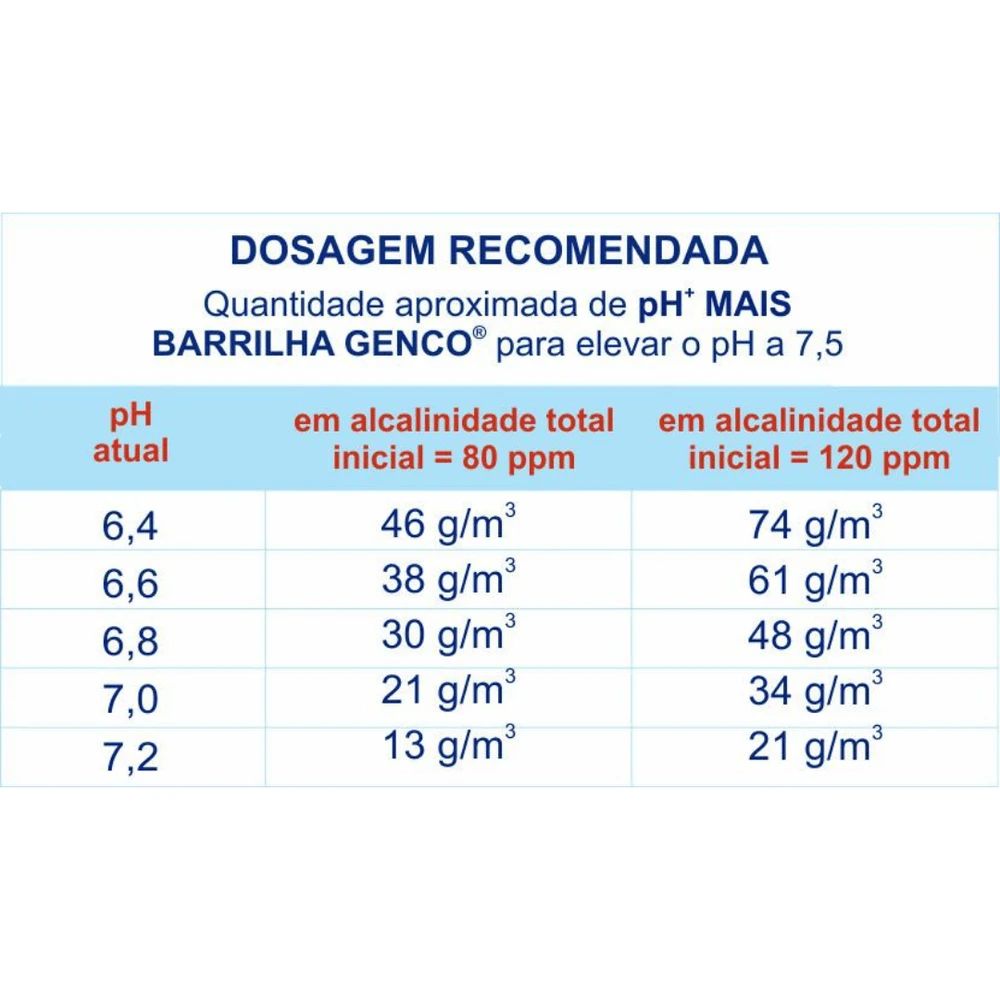 1) A quantidade de pH® MAIS BARRILHA GENCO® a ser utilizada depende de vários fatores além do pH. Baseie-se nas quantidades indicadas na tabela que consta nas imagens do produto.