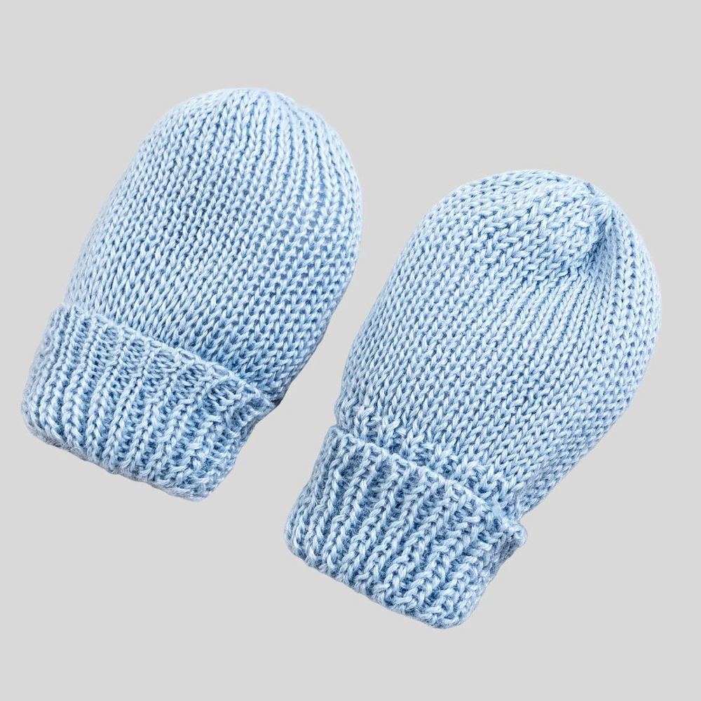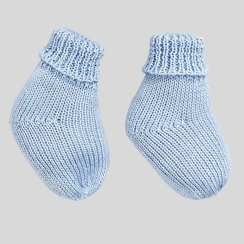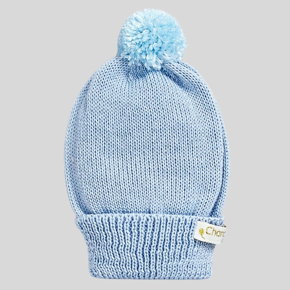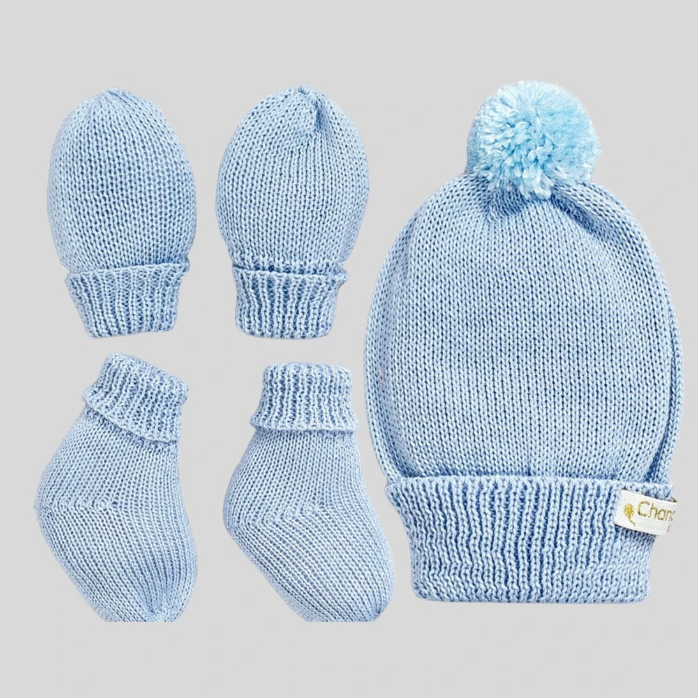 Kit Baby Touca, Luva e Pantufa de Tricô Azul com PomPom, conforto e proteção para os primeiros dias do seu bebê.
