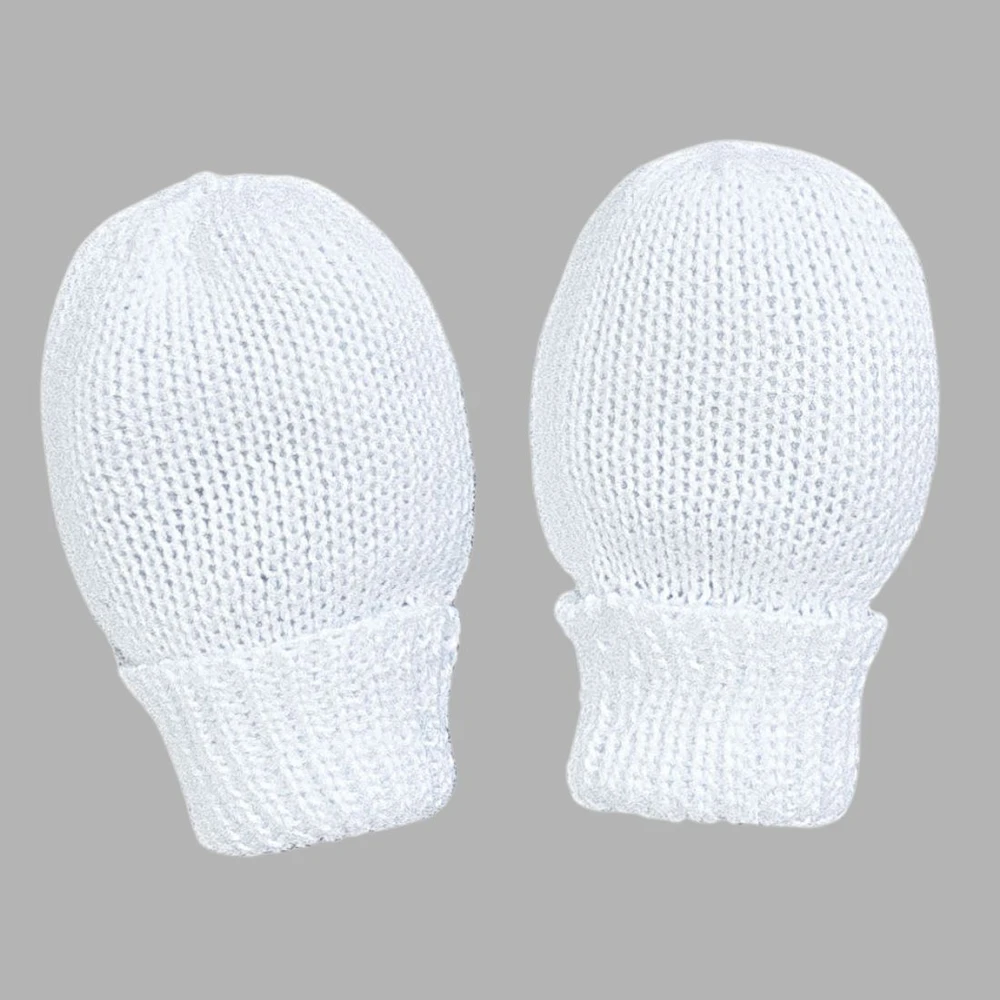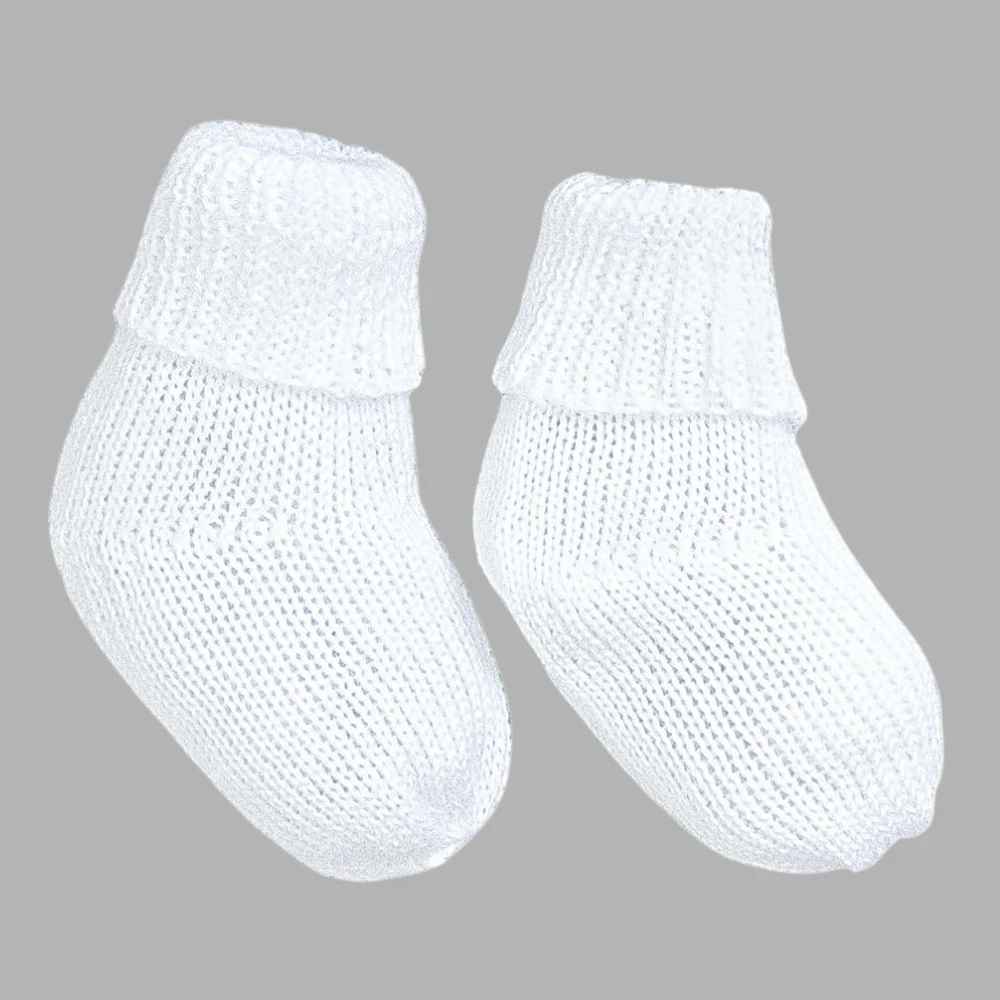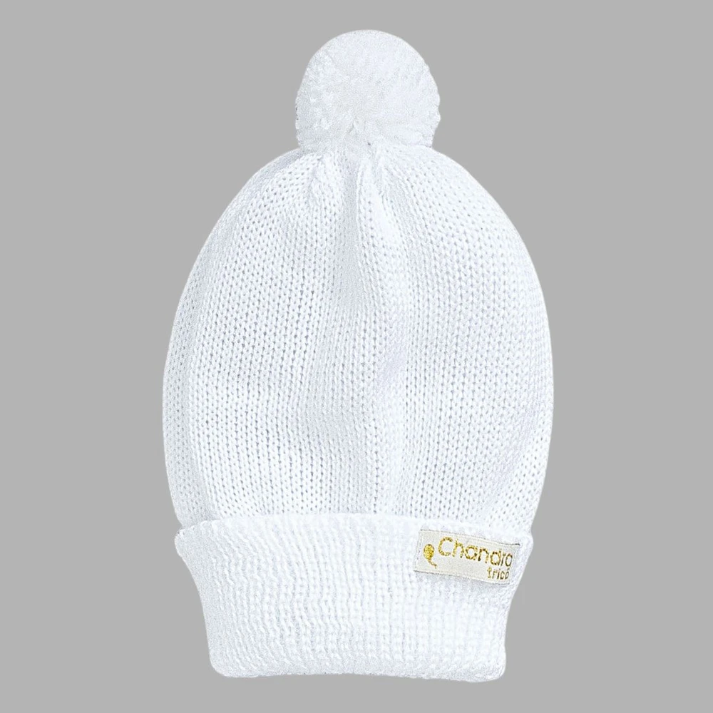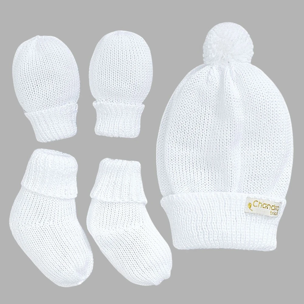 Kit Baby Touca, Luva e Pantufa de Tricô Branco com PomPom, conforto e proteção para os primeiros dias do seu bebê.