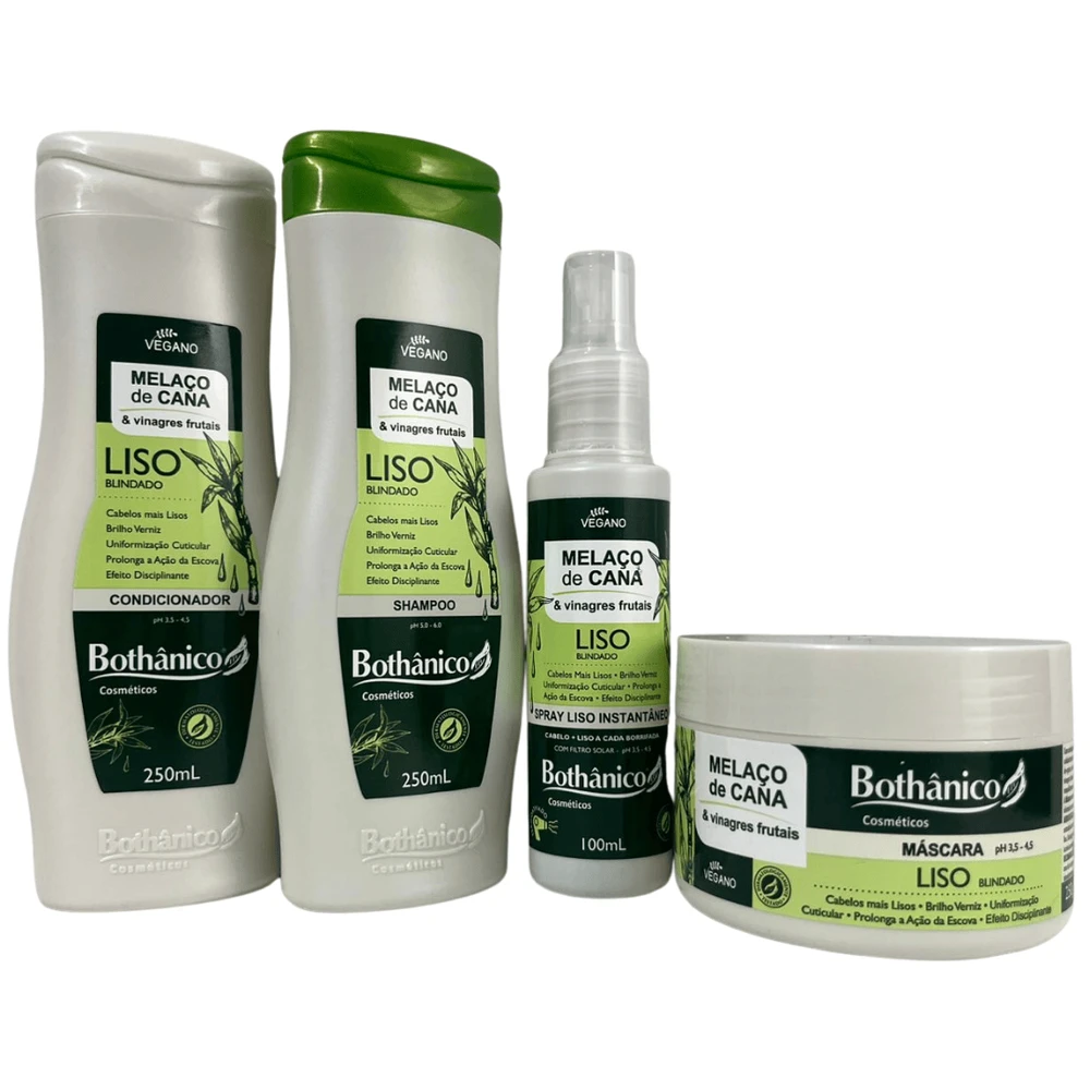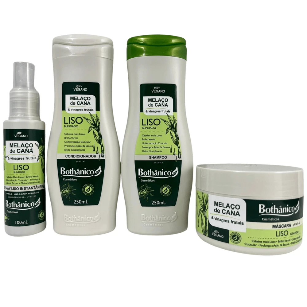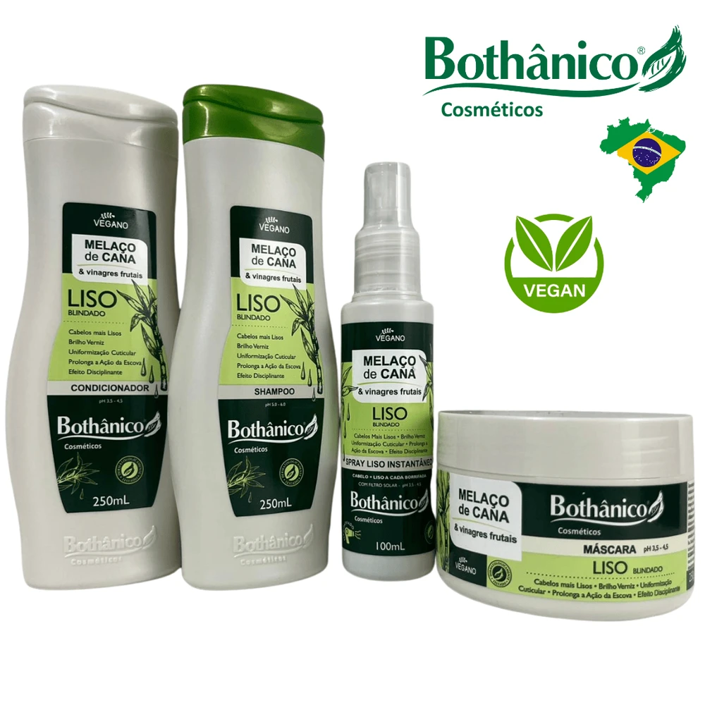 Apresentamos o Kit Completo Melaço de Cana e Vinagres Frutais da Bothanico, a combinação perfeita entre a nutrição rica da natureza e a tecnologia que blinda a cor, sela as cutículas e garante um liso deslumbrante! Dê aos seus cabelos o tratamento de salão em 4 passos essenciais.