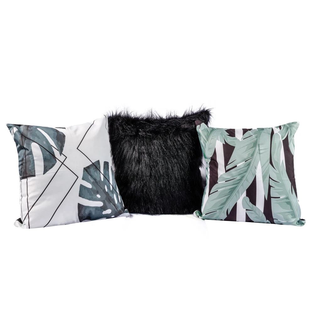 Kit Capas de Almofadas Folhas Verde/Preto Plush 03 Peças - 45cm x 45cm