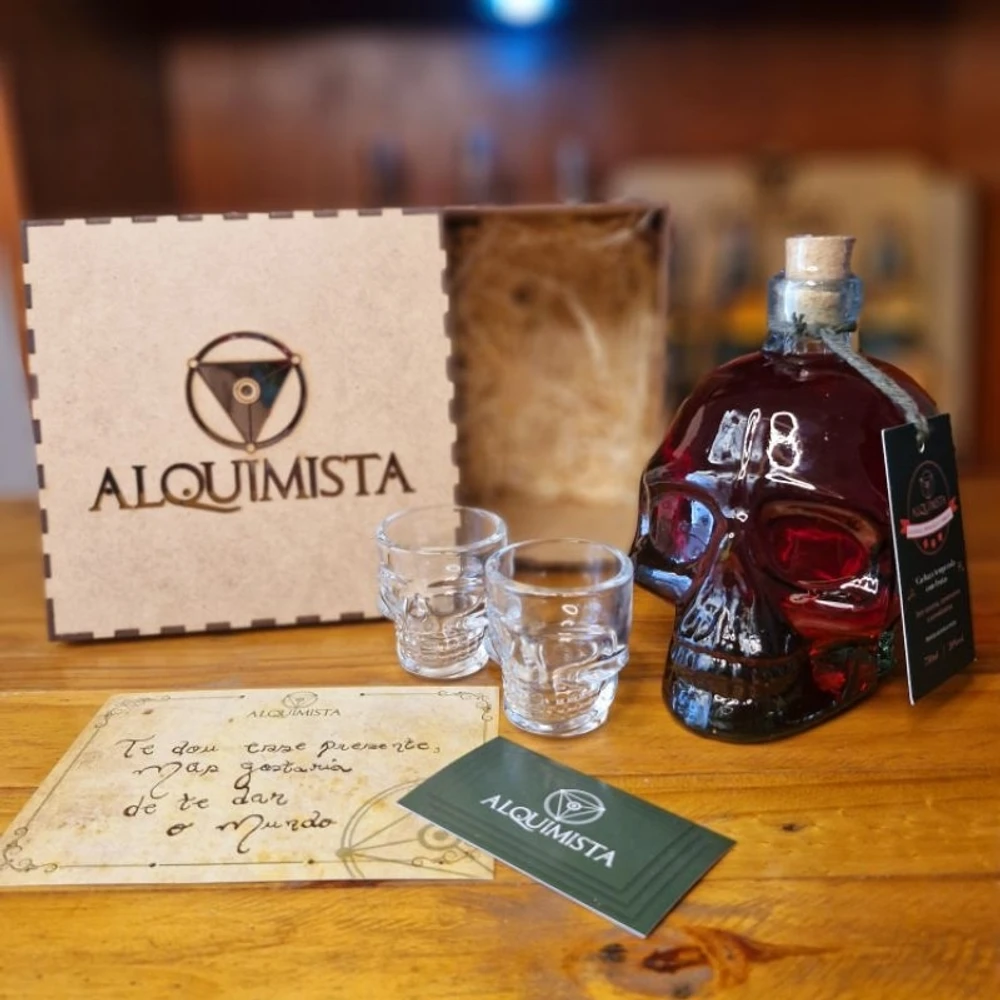 Autêntico, ousado e cheio de atitude. O Kit Caveira Alquimista é o presente ideal para quem valoriza originalidade e um bom drink. Ele traz uma impressionante garrafa de 750ml em formato de caveira, preenchida com o sabor Alquimista de sua escolha — perfeita para surpreender e brindar com presença.