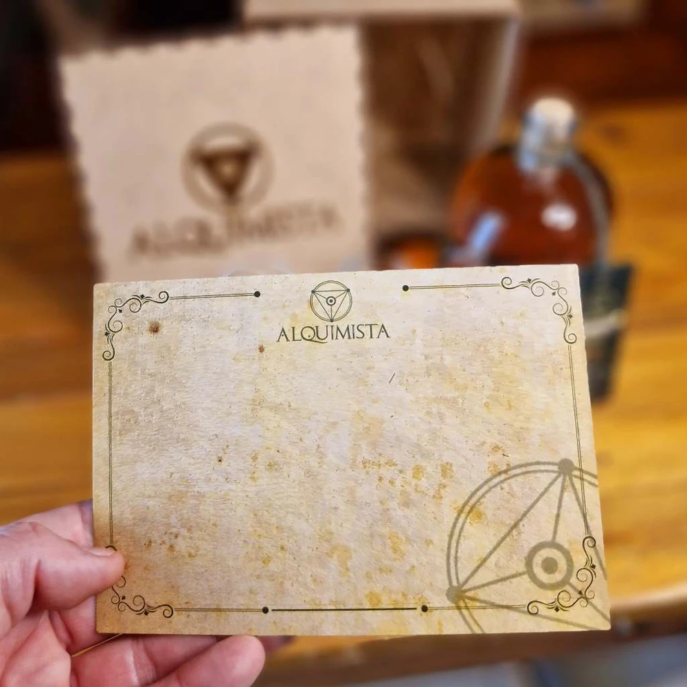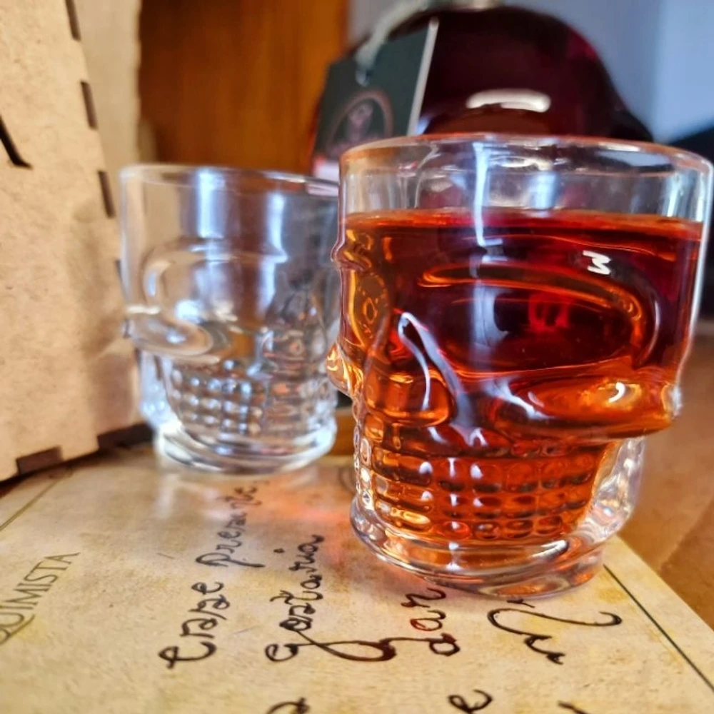 Acompanha dois copos shot de 50ml, também em formato de caveira, tudo isso dentro de uma caixa de MDF personalizada com a marca Alquimista. O kit ainda vai embalado para presente, com saco dourado, fita personalizada e um cartão rústico para mensagem, tornando a experiência completa desde o primeiro olhar.