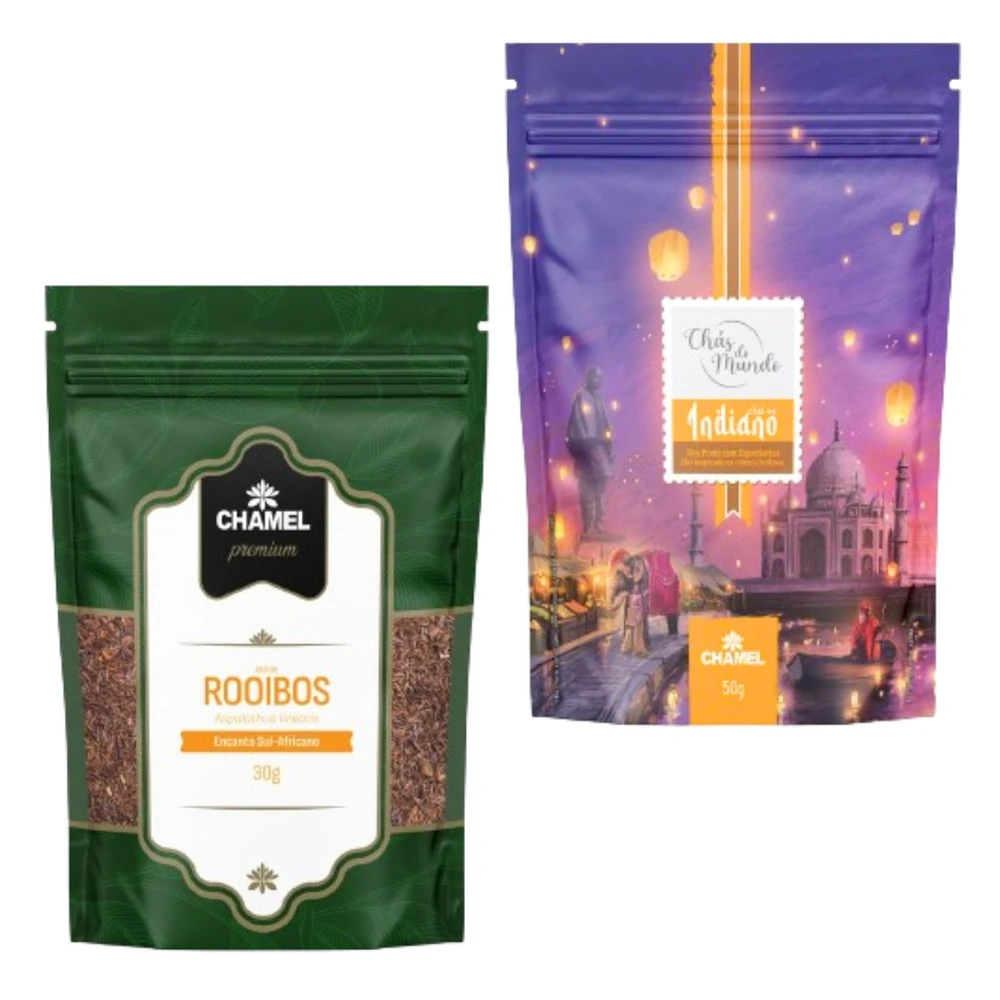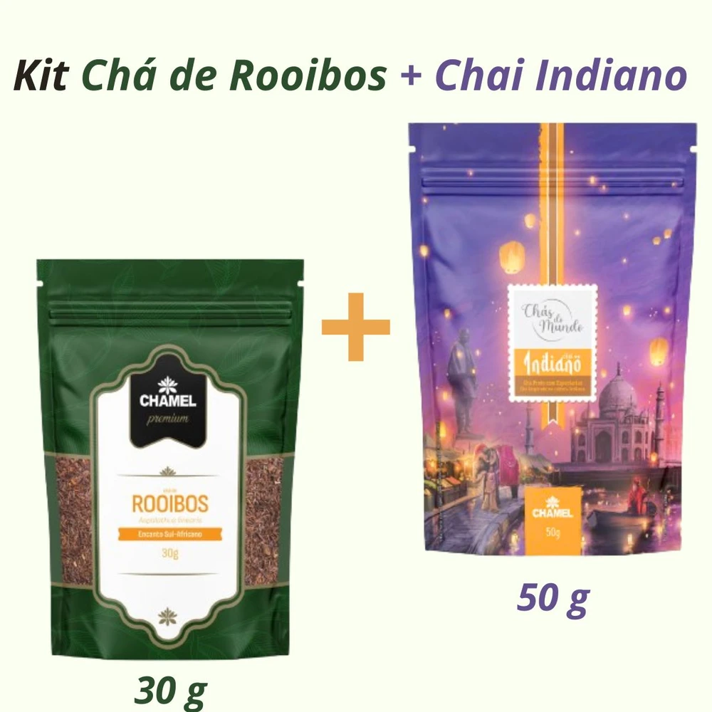 Kit Chá de Rooibos + Chai Indiano Marca: Chamel Para quem aprecia chá aromático e saudável, é uma combinação perfeita! 1) Chá de Rooibos (Aspalathus linearis) Pacote de