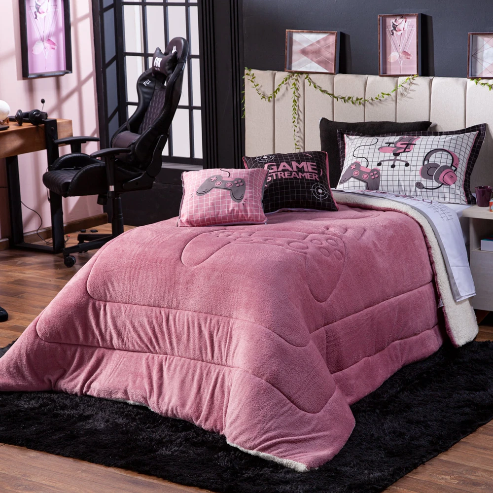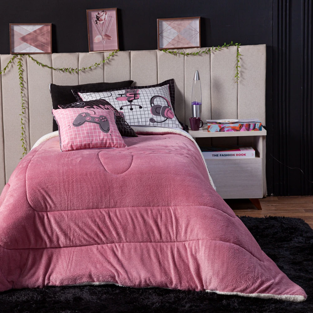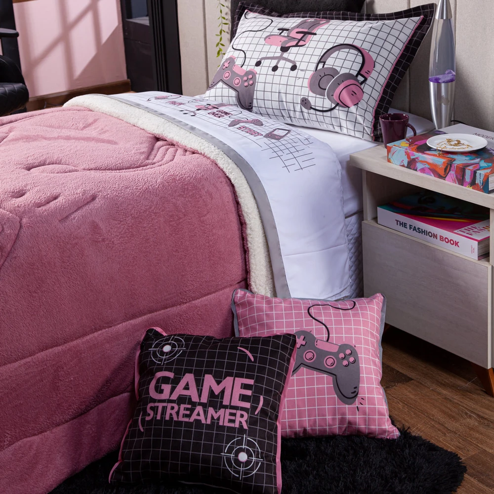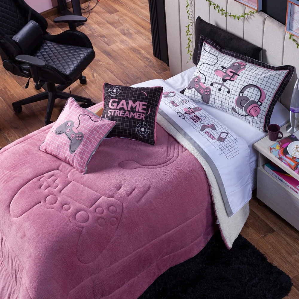 Kit Coberdrom Game Streamer Rosê c/ Almofadas Solteiro 04 Peças - Dupla Face Sherpa e Mantinha
