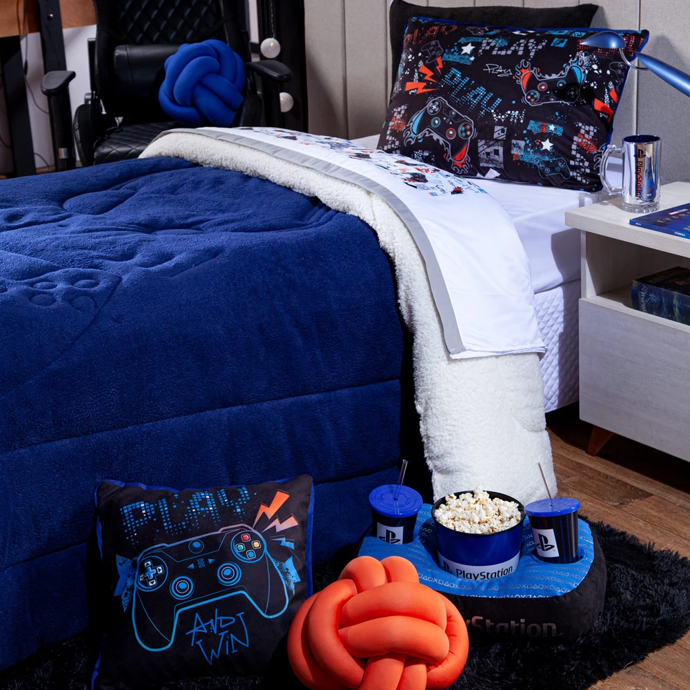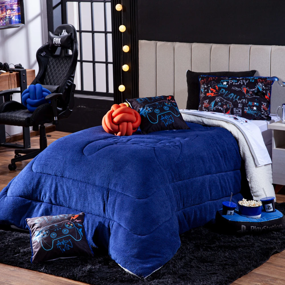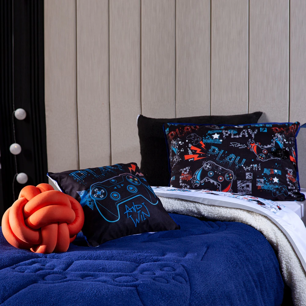 A nova coleção de coberdrons Game Win traz toda a sofisticação e aconchego. Por possuírem dupla face, apresentam superfície que valoriza ainda mais as cores, confeccionado em pantográfica computadorizada com lindos desenhos temáticos pantografados no coberdrom! Composto de Manta Microfibra em poliéster com 150gr de enchimento e em Sherpa simulando lã de carneiro, extremamente macio e perfeito para aquecer. Acompanhando também um porta-travesseiro, uma capinha de almofada estampada e uma de nó lisa, todas temáticas super modernas! Ideal para decorar, trazer conforto e tornar o quarto ainda mais convidativo e elegante! Confira!