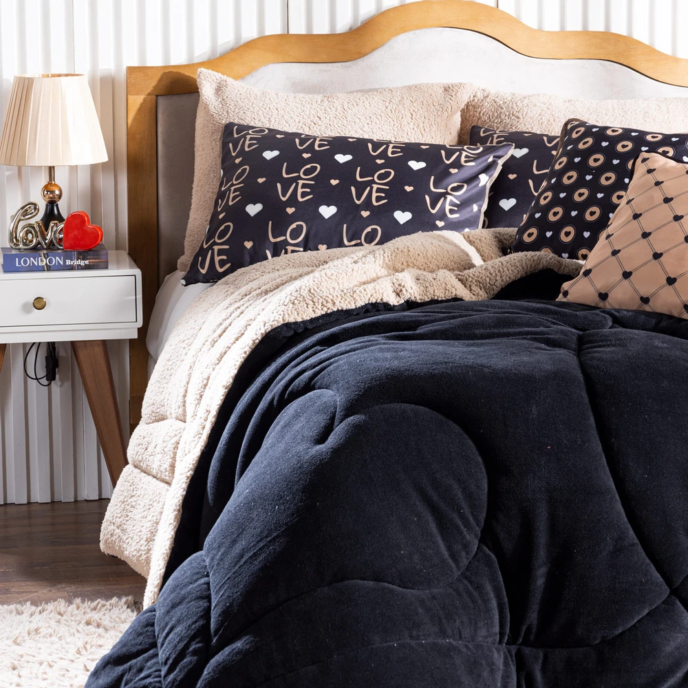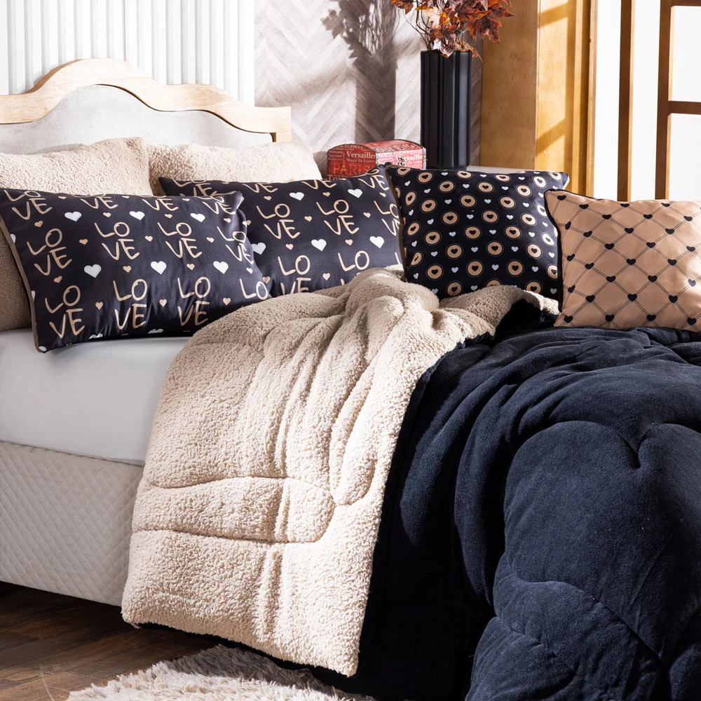 A nova coleção de coberdrons Golden Love traz toda a sofisticação e aconchego. Por possuírem dupla face, apresentam superfície que valoriza ainda mais as cores e também as cores da sherpa colorida, que é a novidade e a tendência do inverno desse ano! Confeccionado em pantográfica computadorizada com lindos desenhos de Corações, perfeito para presentear quem você ama! Composto de Manta Microfibra em poliéster com 150gr de enchimento, sofisticado e extremamente macio, perfeito para aquecer, acompanhando também porta-travesseiros estampados e capinhas de almofadas estampadas temáticas, todas com viés e zíper para facilitar seu dia-a-dia. Ideal para decorar, trazer conforto e tornar o quarto ainda mais convidativo e elegante! Confira!