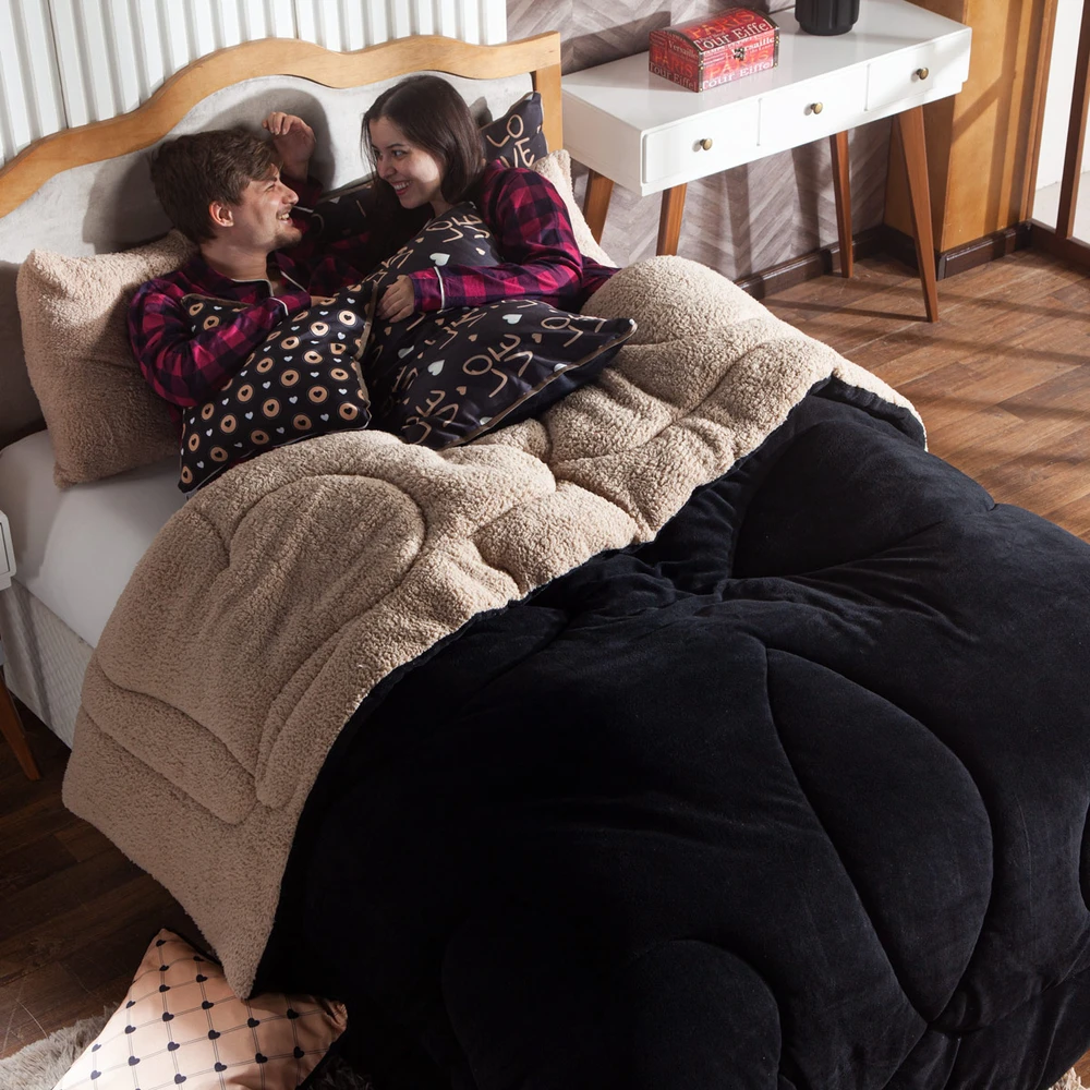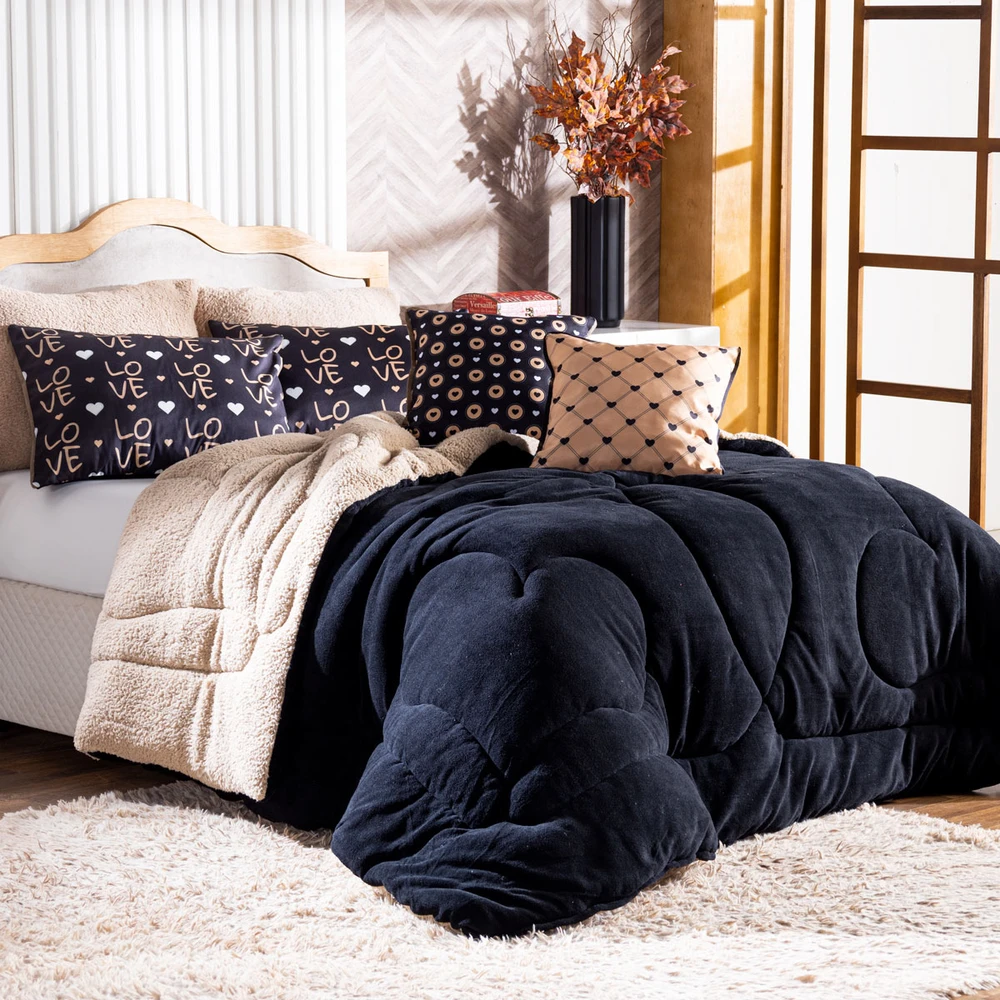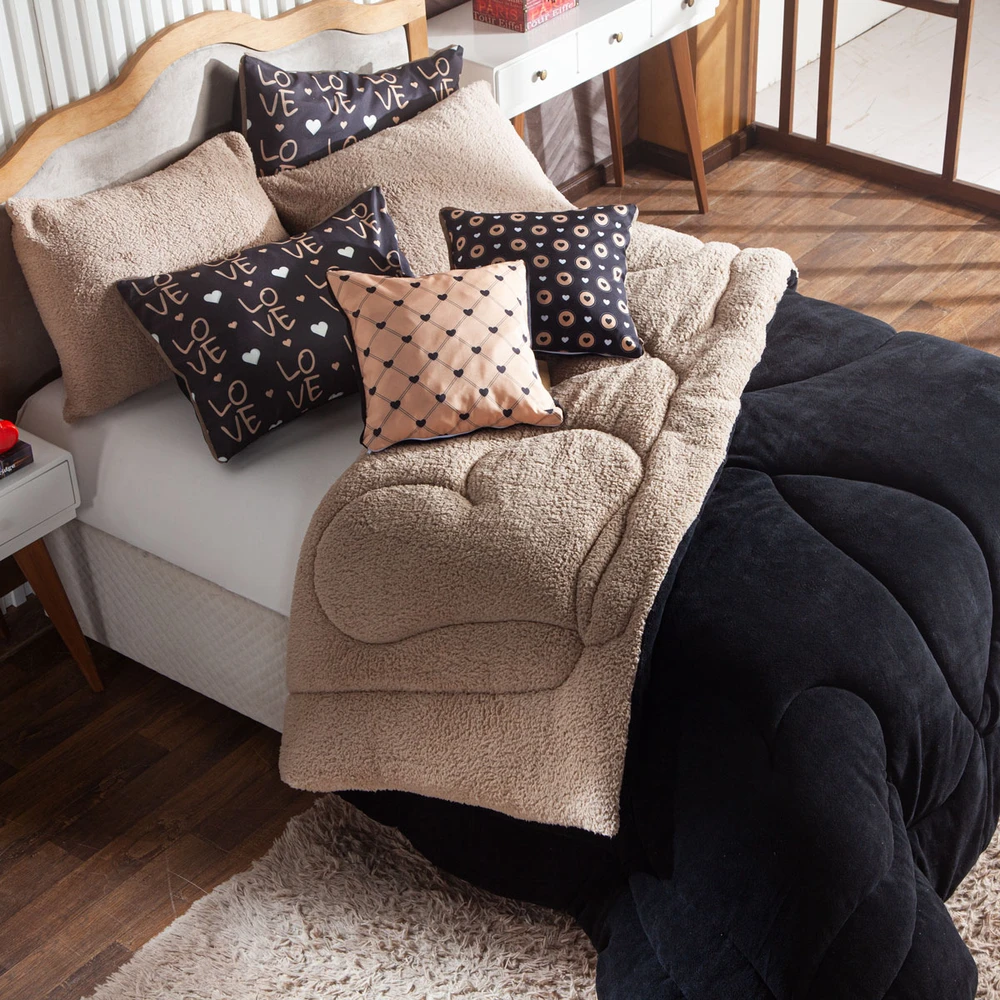 A nova coleção de coberdrons Golden Love traz toda a sofisticação e aconchego. Por possuírem dupla face, apresentam superfície que valoriza ainda mais as cores e também as cores da sherpa colorida, que é a novidade e a tendência do inverno desse ano! Confeccionado em pantográfica computadorizada com lindos desenhos de Corações, perfeito para presentear quem você ama! Composto de Manta Microfibra em poliéster com 150gr de enchimento, sofisticado e extremamente macio, perfeito para aquecer, acompanhando também porta-travesseiros estampados e capinhas de almofadas estampadas temáticas, todas com viés e zíper para facilitar seu dia-a-dia. Ideal para decorar, trazer conforto e tornar o quarto ainda mais convidativo e elegante! Confira!