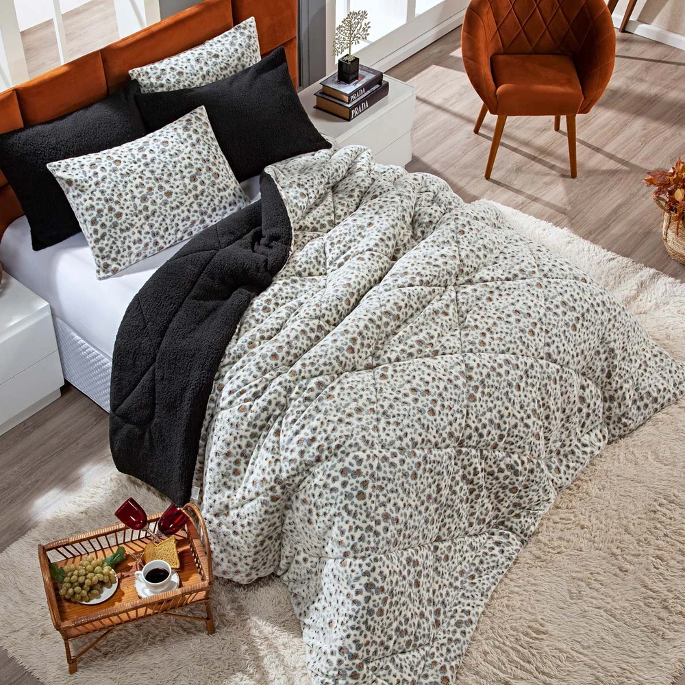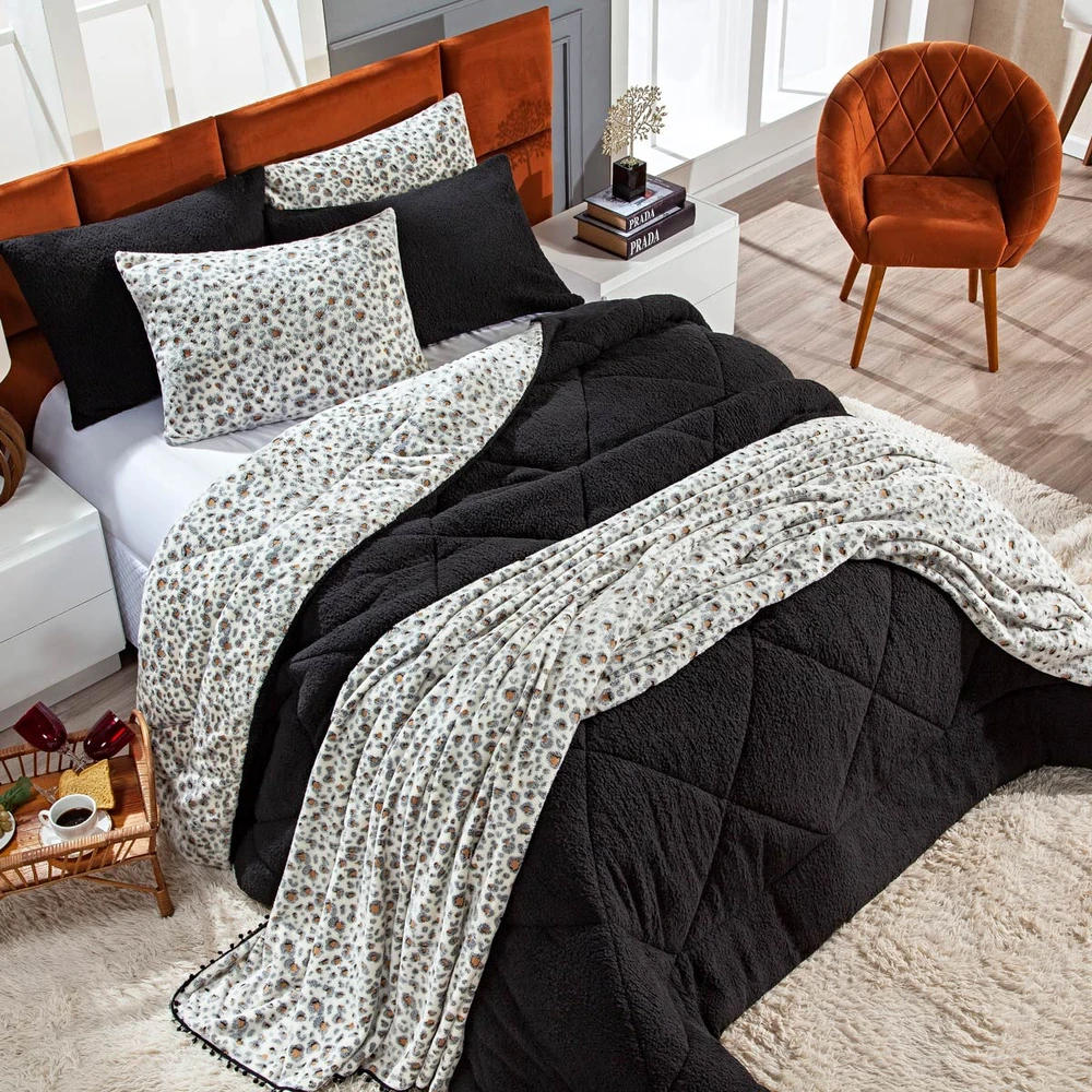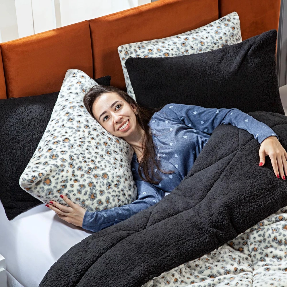 Kit Coberdrom Nevada Estampado Onça Preto KING 03 Peças - Dupla Face Manta e Sherpa Colorida