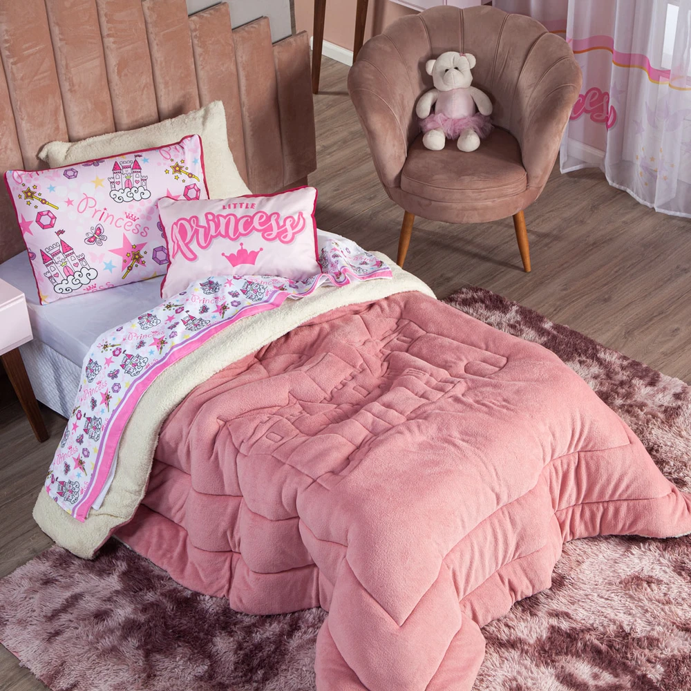 A nova coleção de Coberdrons Princesa traz toda a sofisticação e aconchego. Por possuírem dupla face, apresentam superfície que valoriza ainda mais as cores, confeccionado em pantográfica computadorizada com um lindo desenho temático pantografado no coberdrom! Composto de Manta Microfibra em poliéster com 150gr de enchimento e em Sherpa simulando lã de carneiro, extremamente macio e perfeito para aquecer. Acompanhando também dois porta-travesseiros estampados e uma almofada estampada temática super moderna! Ideal para decorar, trazer conforto e tornar o quarto ainda mais convidativo e elegante para sua princesa! Confira!