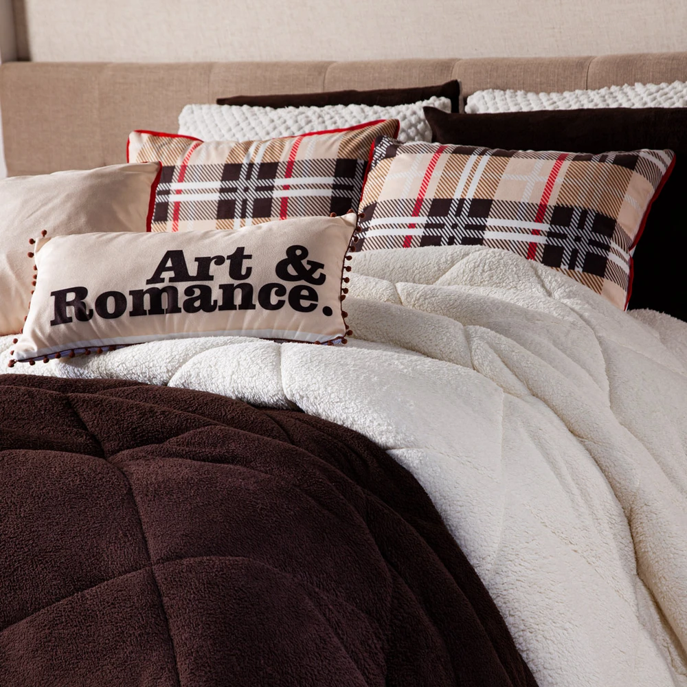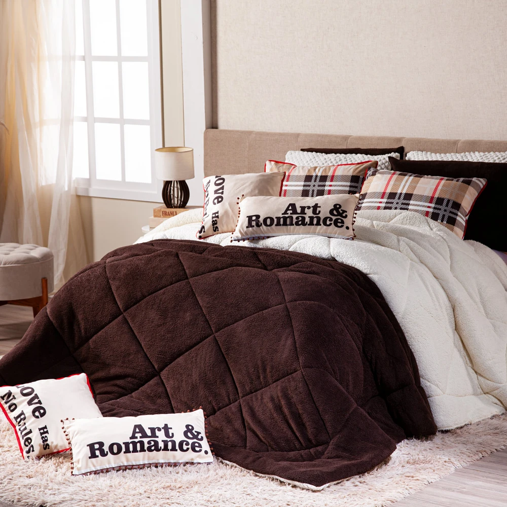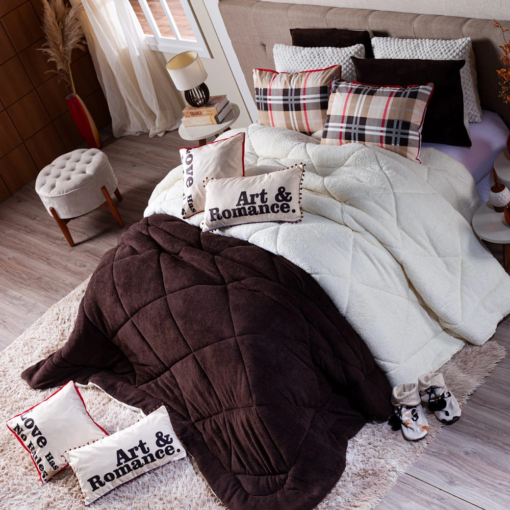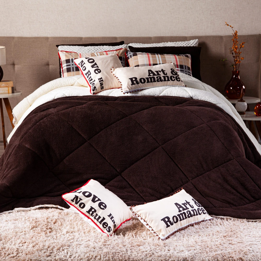 A nova coleção de coberdrons Romance traz toda a sofisticação e aconchego. Por possuírem dupla face, apresentam superfície que valoriza ainda mais as cores, confeccionado em pantográfica computadorizada com lindos desenhos geométricos! Composto de Manta Microfibra em poliéster com 150gr de enchimento e em Sherpa simulando lã de carneiro, extremamente macio e perfeito para aquecer. Acompanhando também porta-travesseiros estampados, capa e almofada com lindas frases românticas, todos confeccionados em tecido suede, com aquele toque aveludado perfeito para deixar seu sono ainda mais aconchegante! Ideal para decorar, trazer conforto e tornar o quarto ainda mais convidativo e elegante! Confira!