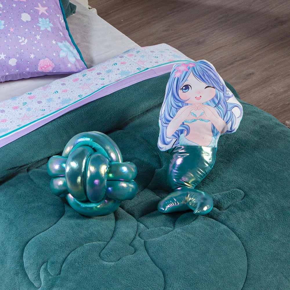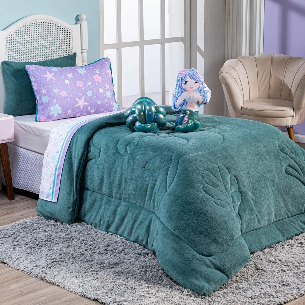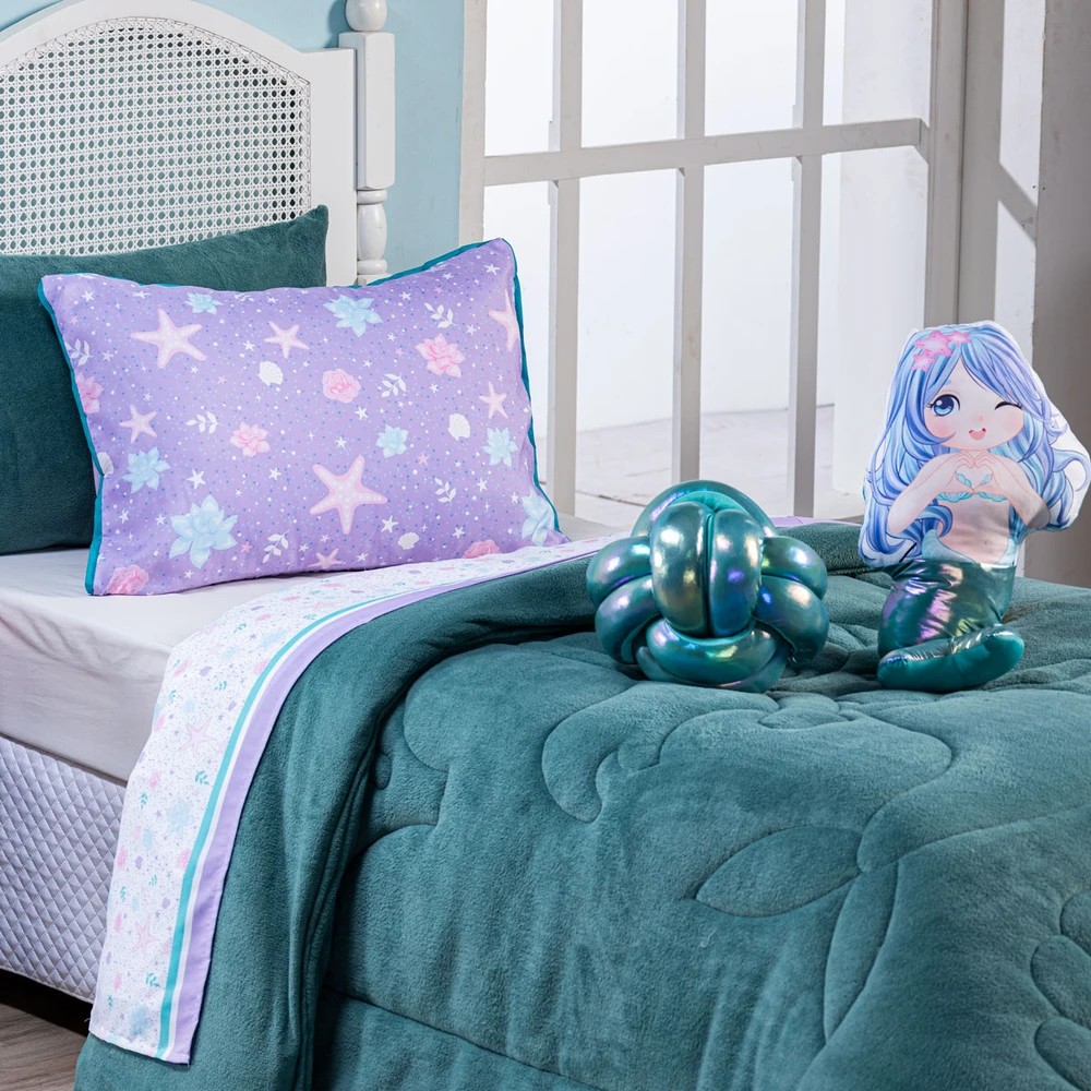 A nova coleção Sereia traz toda a sofisticação e aconchego. Por possuírem dupla face, apresentam superfície que valoriza ainda mais as cores, confeccionado em pantográfica computadorizada com lindos desenhos temáticos pantografados no coberdrom! Composto de Manta Microfibra em poliéster com 150gr de enchimento, extremamente macio e perfeito para aquecer. Acompanhando também um porta-travesseiro em mantinha, uma almofada de nó em malha gel furtacor maravilhosa e também uma almofada em formato de sereia estampada com cauda em malha furtacor super fofa! Todas as almofadas cheias em silicone. Ideal para decorar, trazer conforto e tornar o quarto ainda mais convidativo e elegante! Confira!