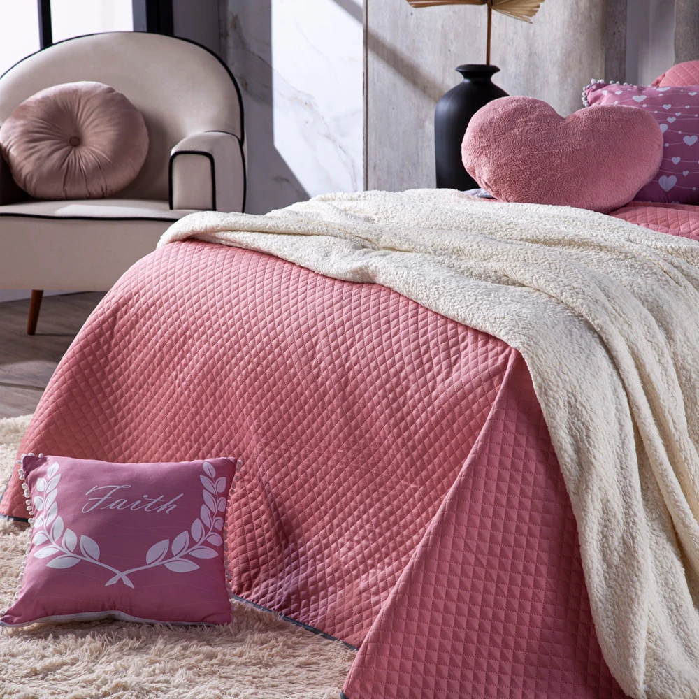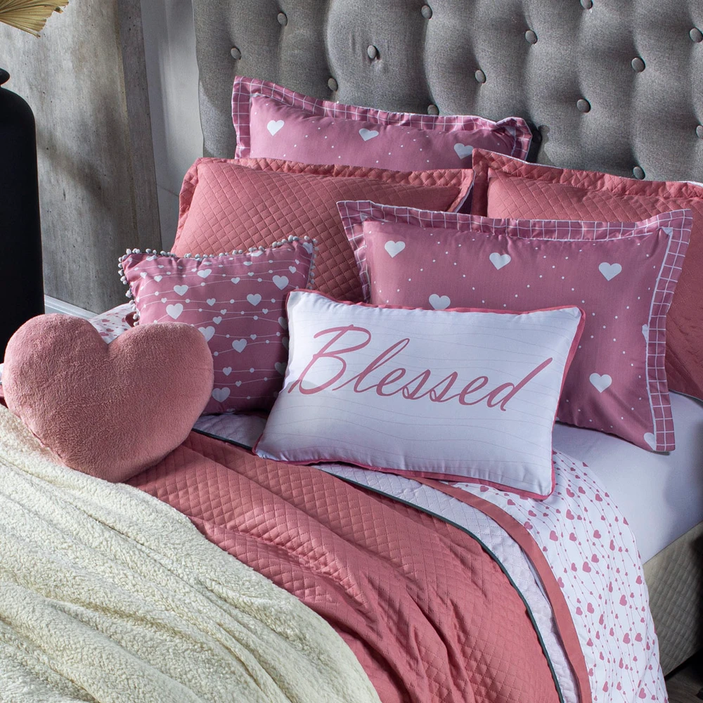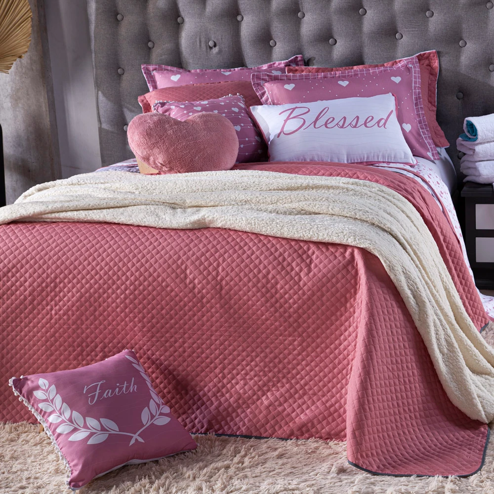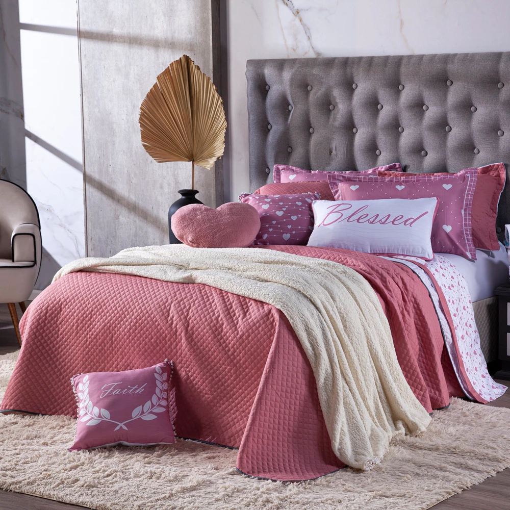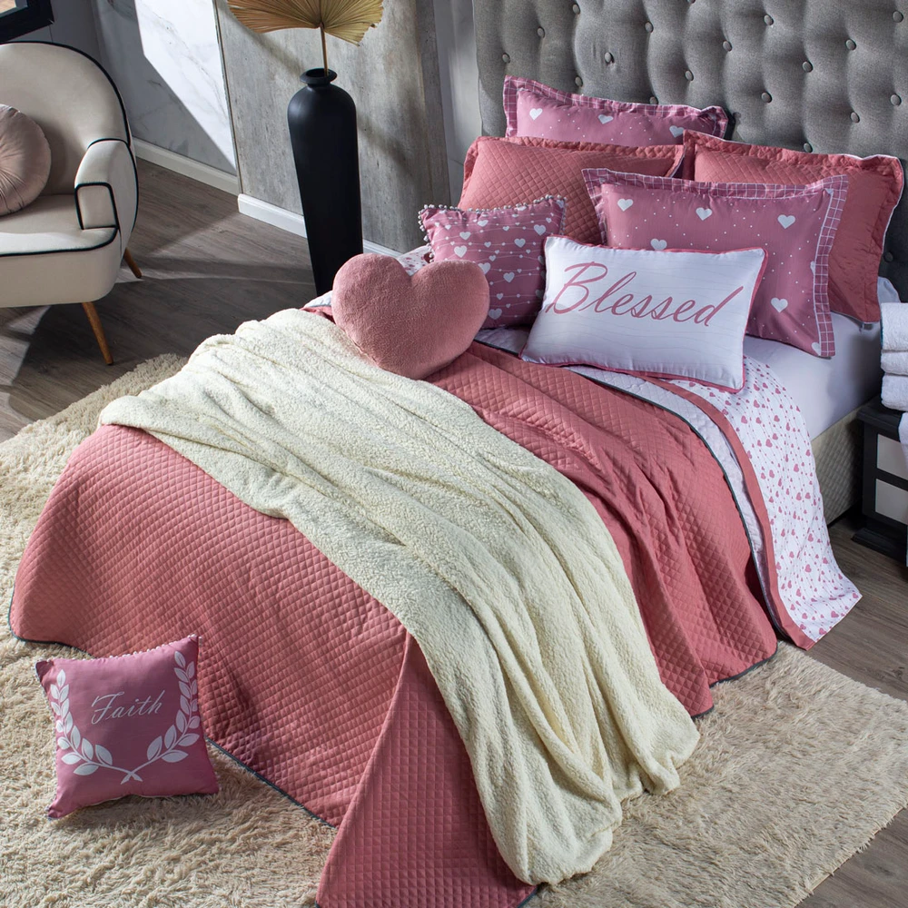 Confeccionado em tecido Microfibra 100% poliéster, a nova Coleção Afrodite vem trazendo um toque macio, com portas em acabamento debrum, o cobre leito com enchimento em manta dupla face, permitindo o uso dos dois lados (Rosê e Branco) com lindos detalhes nos porta-travesseiros e nas capinhas de almofadas estampadas com pompom e viés, tudo para combinar com a sua decoracao! Acompanhando também uma linda almofada retangular e uma com formato de coração em pelúcia (Plush). Produzido num rigoroso controle de qualidade, dando um toque de requinte para o ambiente. Confira!