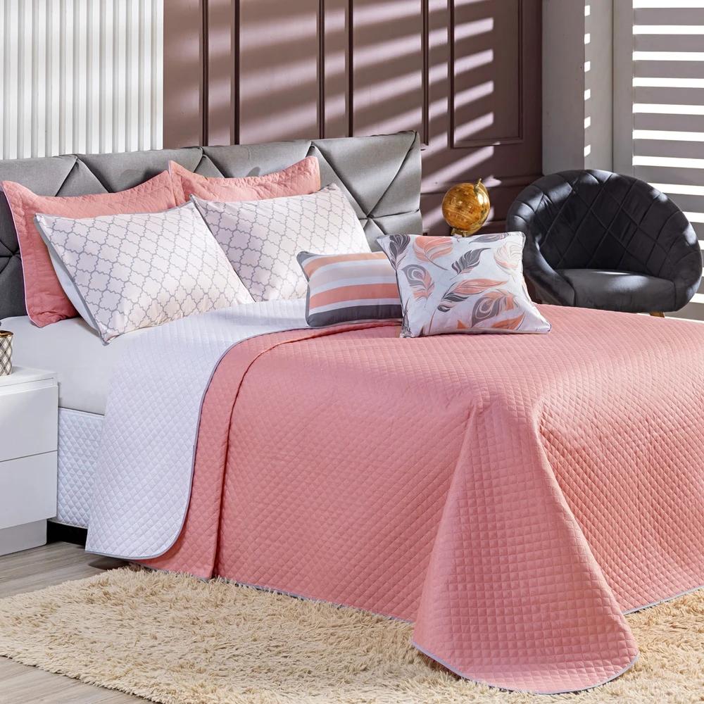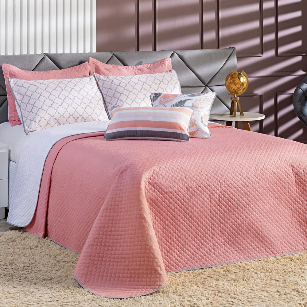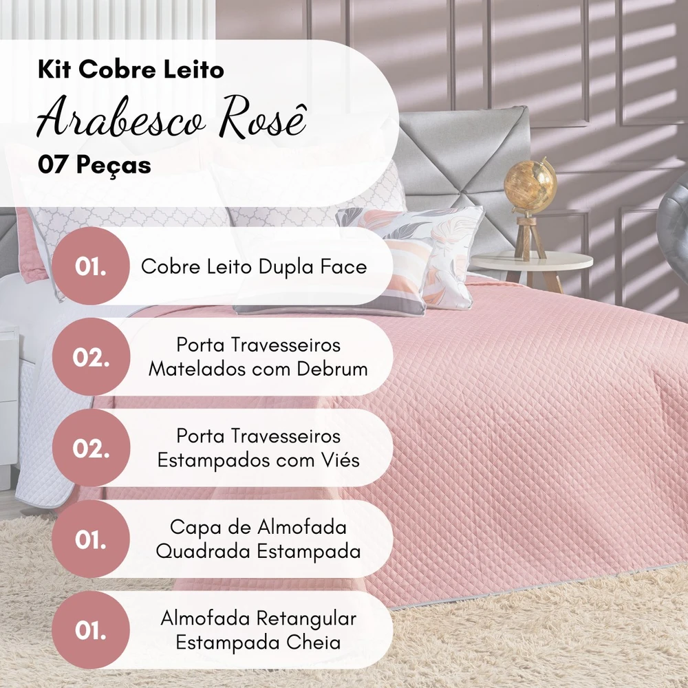 Apresentamos o encantador Kit Cobre Leito Arabesco Rosê, uma adição irresistível para o seu quarto. Este conjunto de 7 peças combina sofisticação e conforto em uma única oferta. Com um delicado padrão de arabesco em tons de rosê e branco, o cobre leito oferece versatilidade com sua opção dupla face, permitindo que você altere o visual do seu espaço com facilidade. As almofadas coordenadas adicionam um toque final de elegância e conforto, proporcionando uma atmosfera acolhedora. Fabricado com materiais de qualidade, este kit garante durabilidade e suavidade ao toque, tornando-se uma escolha ideal para elevar a decoração do seu quarto. Transforme sua área de descanso em um refúgio de beleza e conforto com este Kit. Confira!