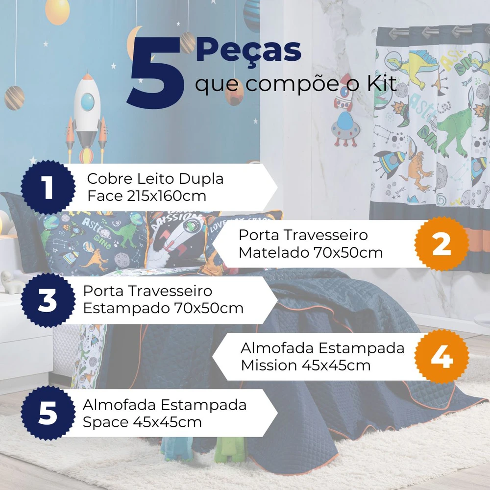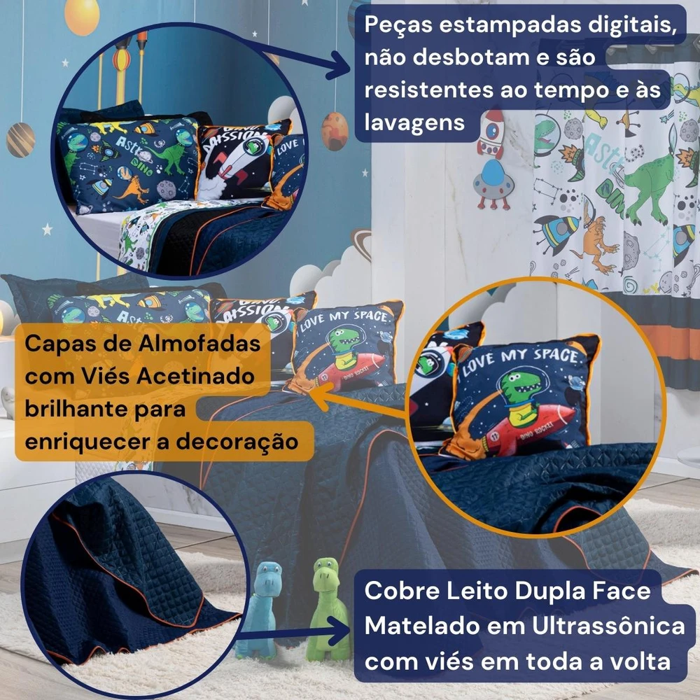 A Nova Coleção Astrodino em Microfibra tem um toque suave e macio, o tecido caracteriza-se por ser muito leve, confortável, sedoso, com secagem rápida e ótimo caimento. Vem trazendo estilo para a decoração de seu quarto na nova tendência Dupla Face, podendo utilizar as 2 cores do cobre leito! Ficará de ótimo bom gosto e elegância, acompanhando porta-travesseiro e duas almofadinhas estampadas super modernas e temáticas de Dinossauros! Tudo para combinar com a decoração, perfeito para dar aquele upgrade no ambiente ou para presentear quem você ama! Confira!