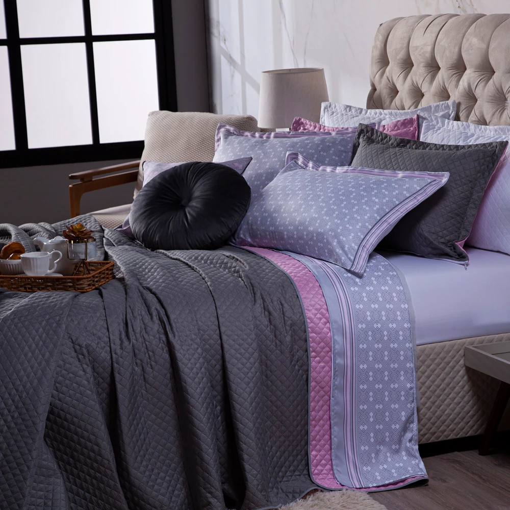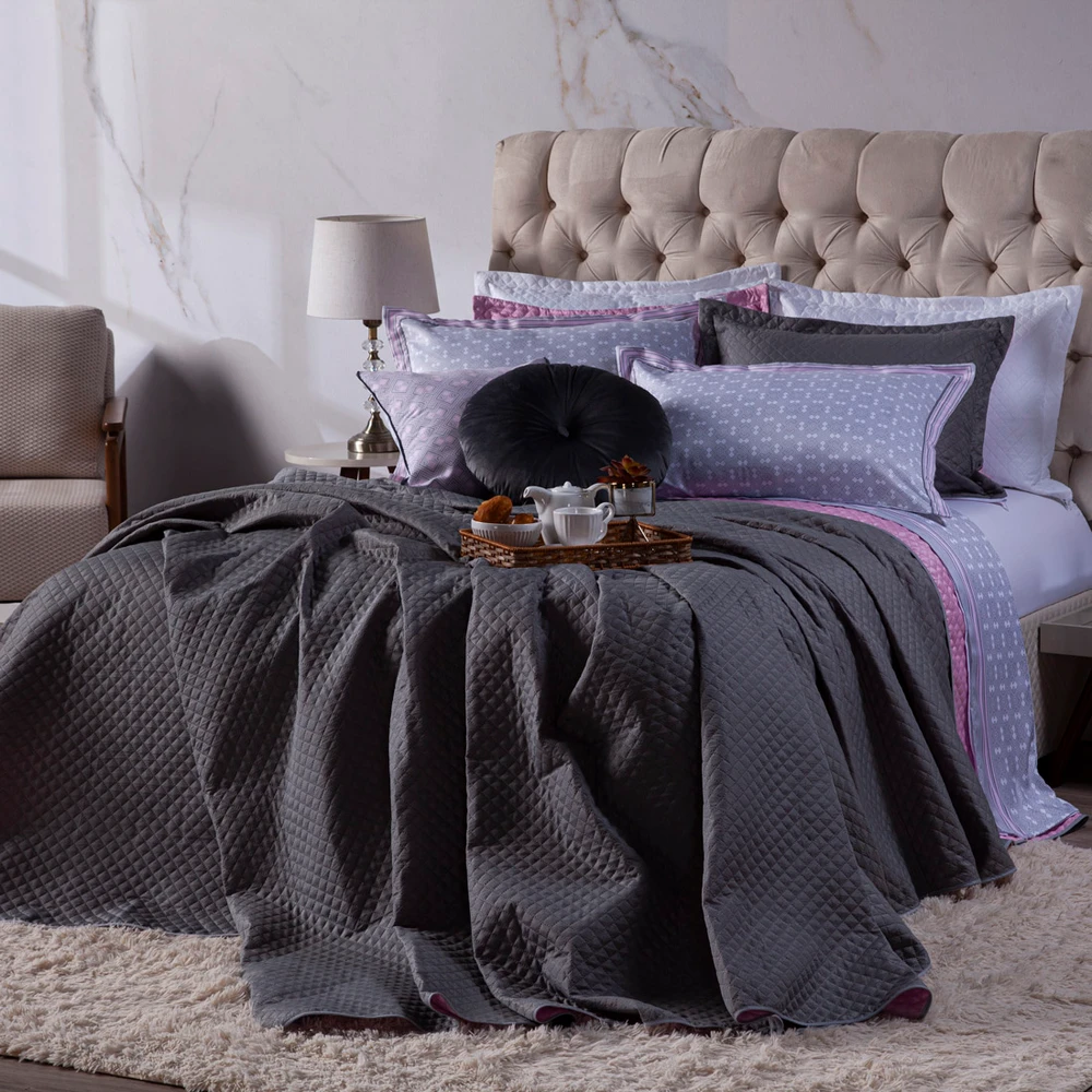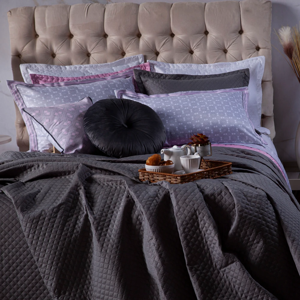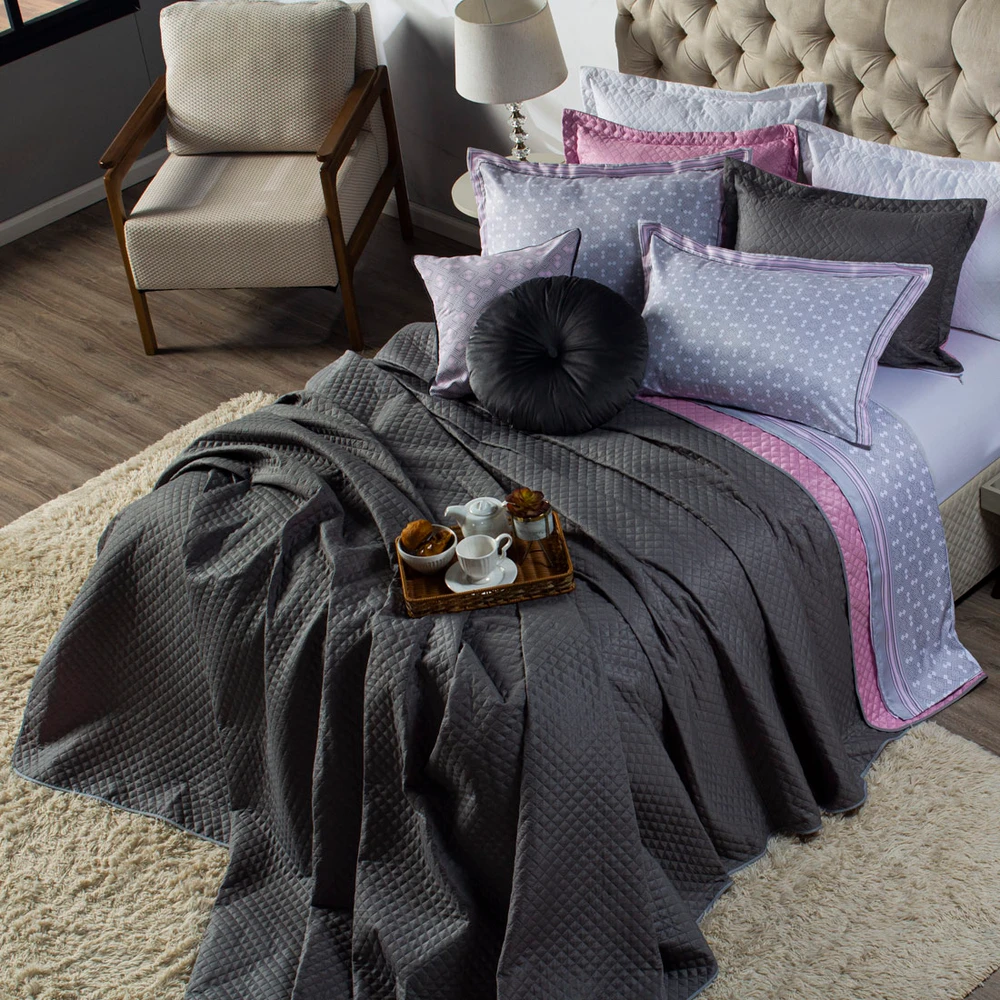 Confeccionado em tecido Microfibra 100% Políester, a nova Coleção Atrina vem trazendo um toque macio, com portas estampados em acabamento debrum, o cobre leito com enchimento em manta dupla face, permitindo o uso dos dois lados (Cinza e Rosa) com lindos detalhes nos porta-travesseiros matelados e na almofadinha estampada com viés, acompanhando também uma linda almofada redonda em veludo, aquele toque perfeito para trazer conforto e beleza na sua decoração. Tudo para combinar com a sua cama! Produzido num rigoroso controle de qualidade, dando um toque de requinte para o ambiente. Confira!