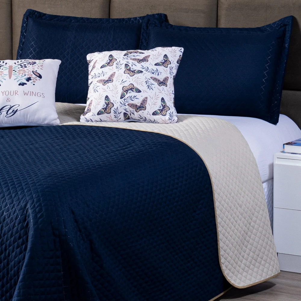 Confeccionado em tecido Microfibra Poliéster, a nova Coleção Borboleta vem trazendo um toque macio, com portas em acabamento debrum, o cobre leito com enchimento em manta dupla face, combinando cores modernas, permitindo o uso dos dois lados (Azul Marinho e Caqui), tudo para combinar com a sua decoração! Acompanhando duas lindas capas de almofadas estampadas digitais com zíper, facilitando a lavagem e o seu dia a dia para montar a cama do seu jeito! Produzido num rigoroso controle de qualidade, dando um toque de requinte para o ambiente. Confira!