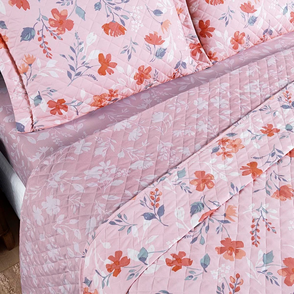 Kit Cobre Leito Colcha Belle Casal Padrão Estampado Dupla Face 400 Fios 3 Peças Floral Rosê