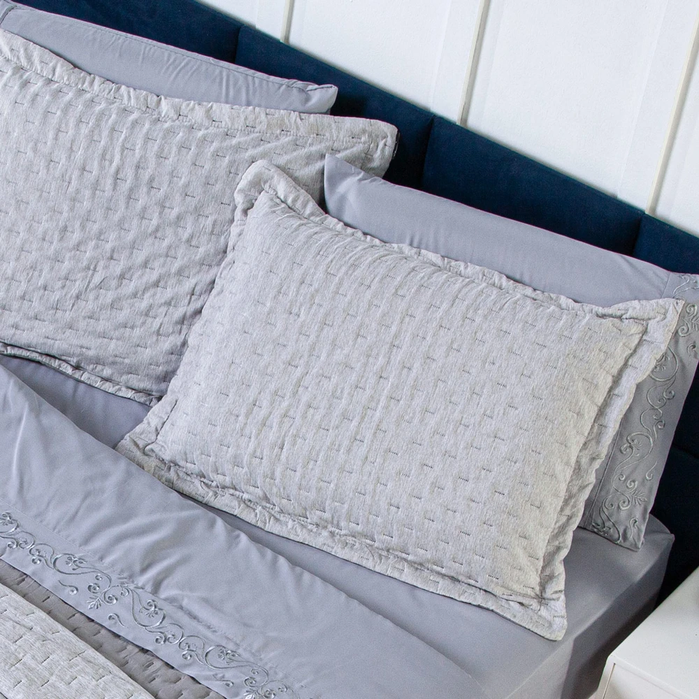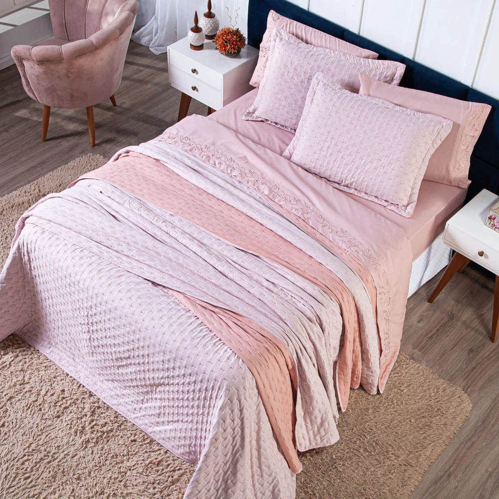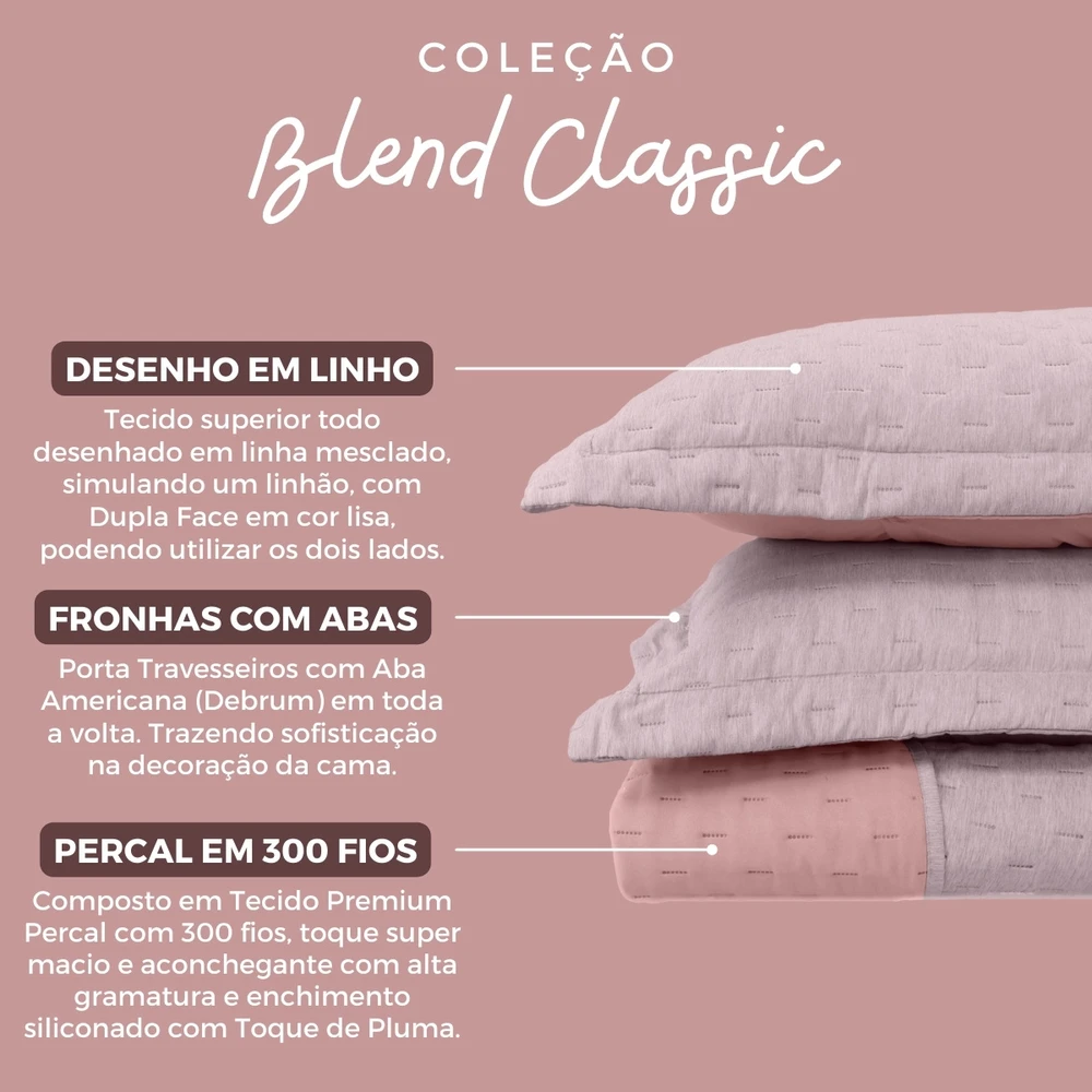 Transforme o ambiente do seu quarto com o Kit Blend, que combina sofisticação, conforto e praticidade. Confeccionado em tecido Percal de 300 fios, este kit oferece uma sensação suave e macia, pois possui enchimento exclusivo em silicone com toque de pluma, ideal para proporcionar noites de descanso tranquilas e agradáveis. A colcha feita em matelassê ultrassônico é dupla face, permitindo variação de estilo e cores conforme sua preferência. De um lado, o elegante desenho de linho mesclado, que traz um toque natural e requintado, e, do outro, um acabamento liso e delicado, perfeito para quem busca versatilidade. O design moderno e atemporal agrega beleza e aconchego ao seu quarto. Acompanhando duas fronhas com debrum, conferindo um acabamento impecável e sofisticado. O Kit é ideal para quem deseja renovar a decoração com um produto de alta qualidade, fácil de cuidar e com excelente durabilidade. Confira!