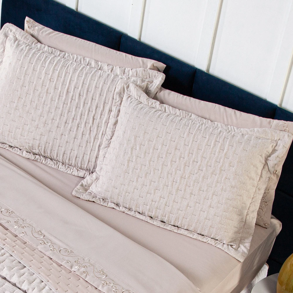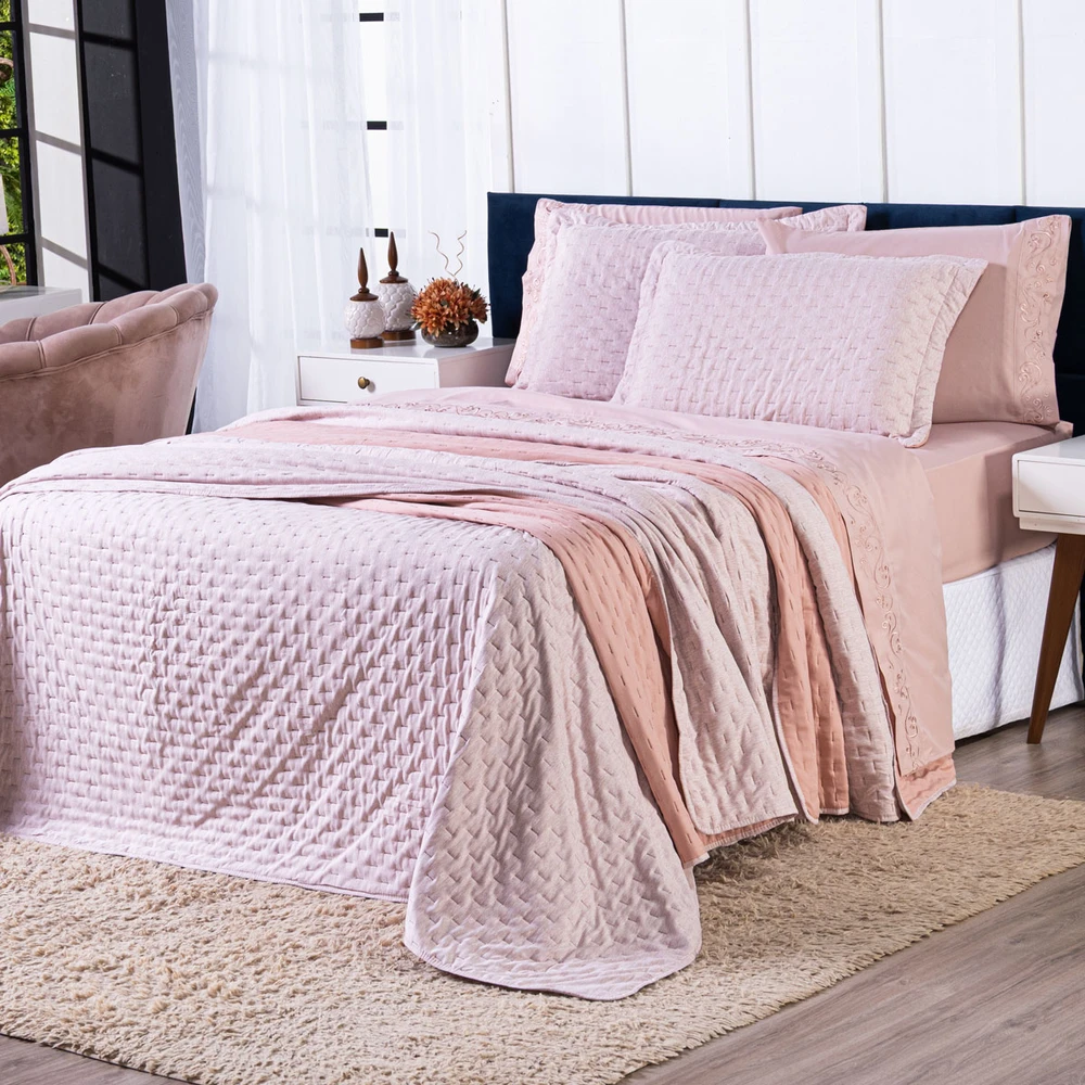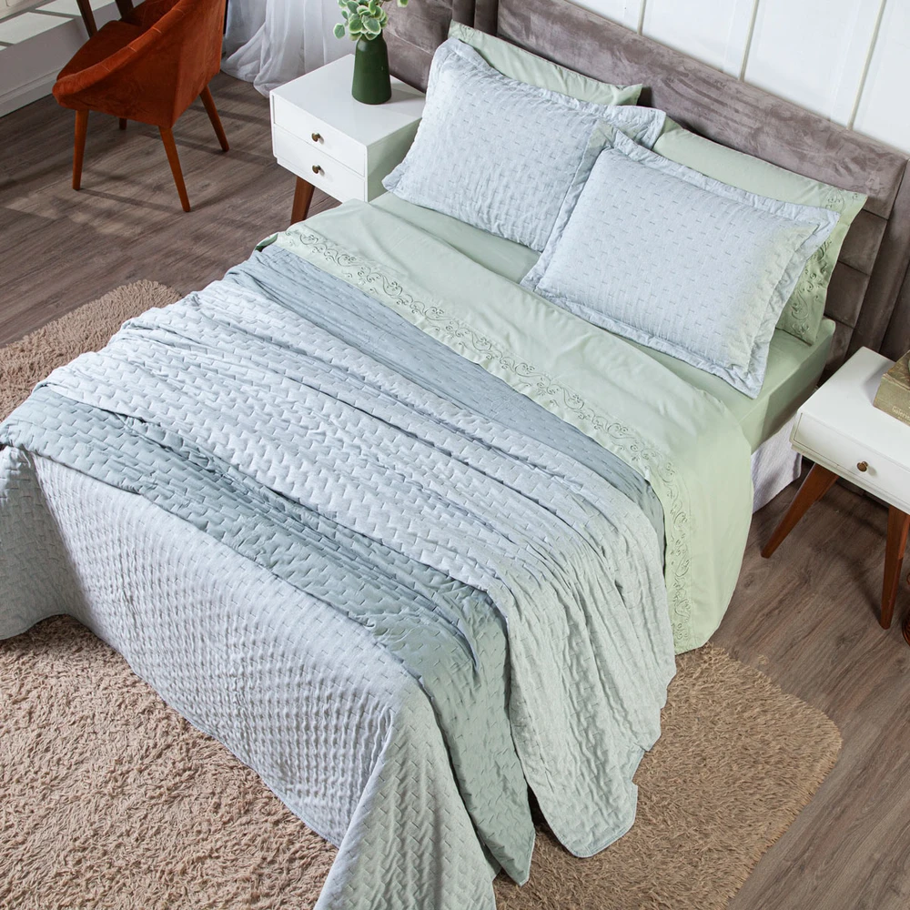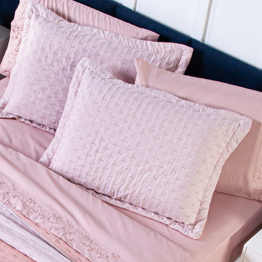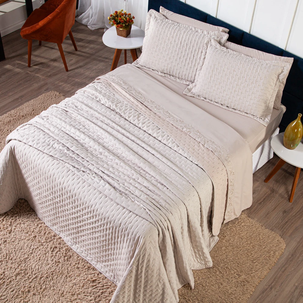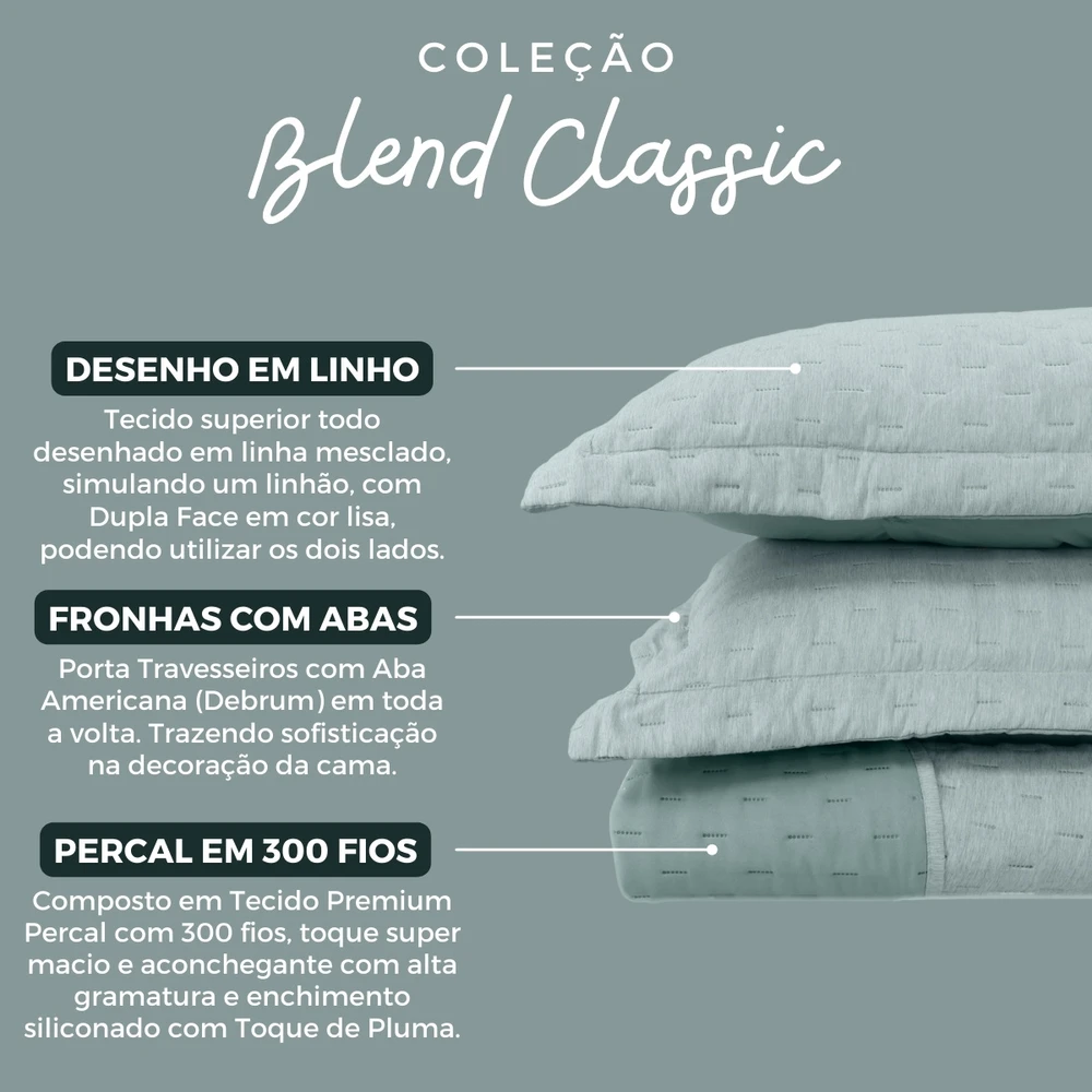 Transforme o ambiente do seu quarto com o Kit Blend, que combina sofisticação, conforto e praticidade. Confeccionado em tecido Percal de 300 fios, este kit oferece uma sensação suave e macia, pois possui enchimento exclusivo em silicone com toque de pluma, ideal para proporcionar noites de descanso tranquilas e agradáveis. A colcha feita em matelassê ultrassônico é dupla face, permitindo variação de estilo e cores conforme sua preferência. De um lado, o elegante desenho de linho mesclado, que traz um toque natural e requintado, e, do outro, um acabamento liso e delicado, perfeito para quem busca versatilidade. O design moderno e atemporal agrega beleza e aconchego ao seu quarto. Acompanhando duas fronhas com debrum, conferindo um acabamento impecável e sofisticado. O Kit é ideal para quem deseja renovar a decoração com um produto de alta qualidade, fácil de cuidar e com excelente durabilidade. Confira!