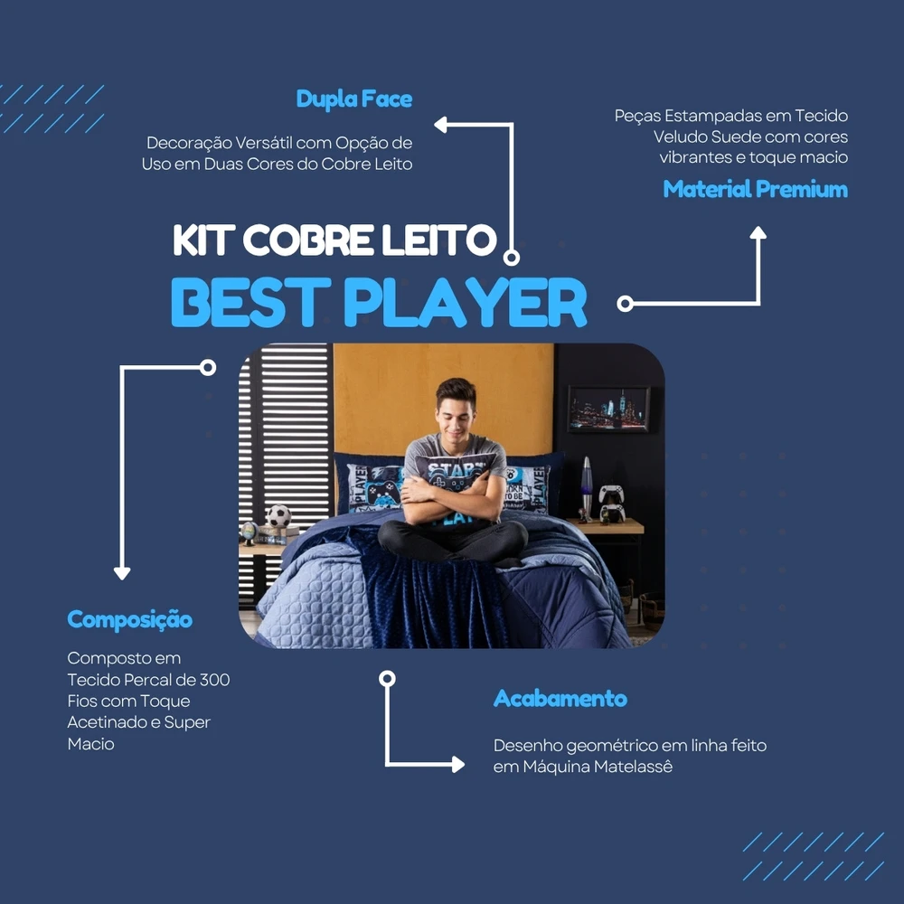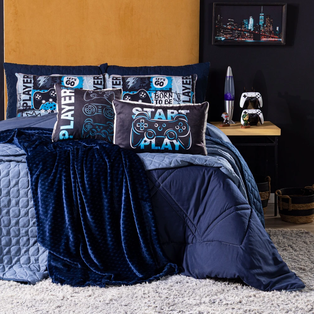 O Kit Cobre Leito Best Player é a escolha ideal para quem ama o universo gamer e quer levar estilo e conforto para o quarto. Produzido em tecido Percal de 300 fios, possui toque acetinado e super macio, garantindo noites mais aconchegantes. O design é inspirado na cultura dos games, com estampas de controles, frases temáticas e elementos gamer que deixam o ambiente moderno e cheio de personalidade. O cobre leito é dupla face, com costura em matelassê que forma desenhos em linha e um acabamento sofisticado. O kit é composto por 1 cobre leito dupla face, 2 porta-travesseiros matelados, 2 porta-travesseiros estampados com viés, 1 capa de almofada quadrada estampada e 1 almofada cheia retangular estampada com viés, totalizando as 7 peças que unem beleza e conforto em um só conjunto. Confira!