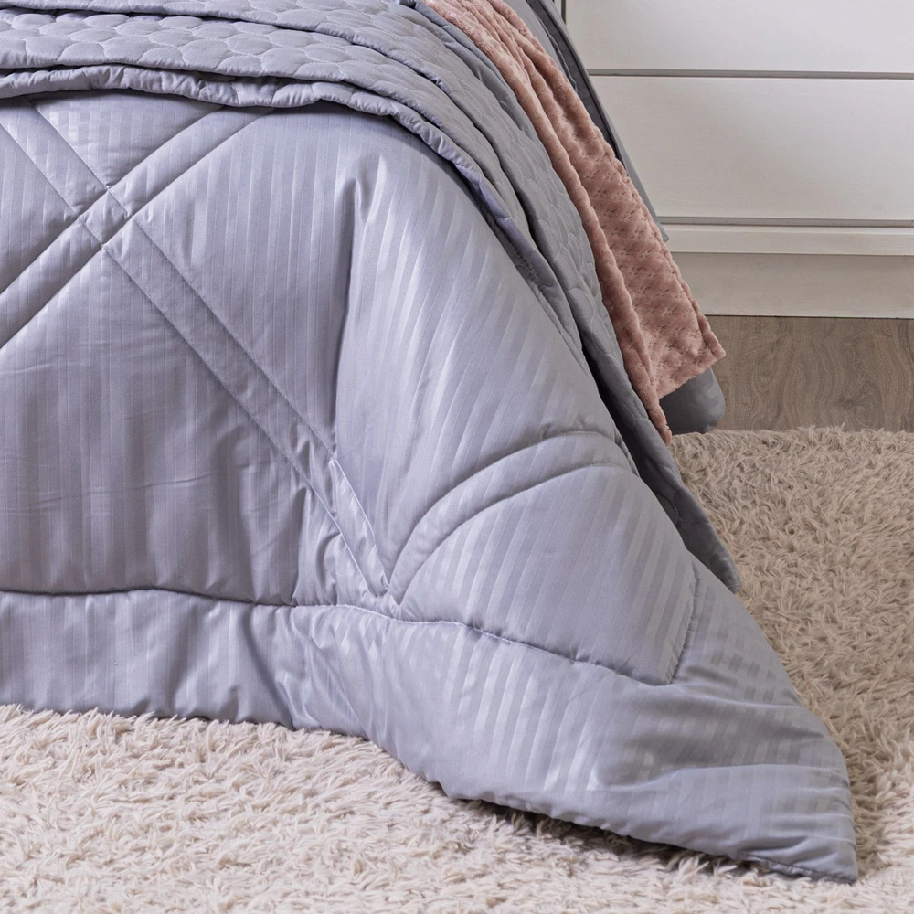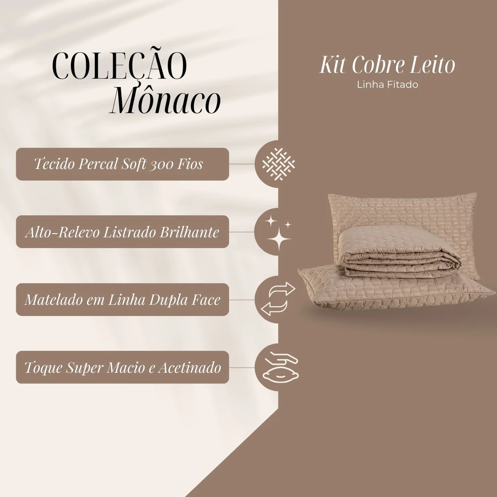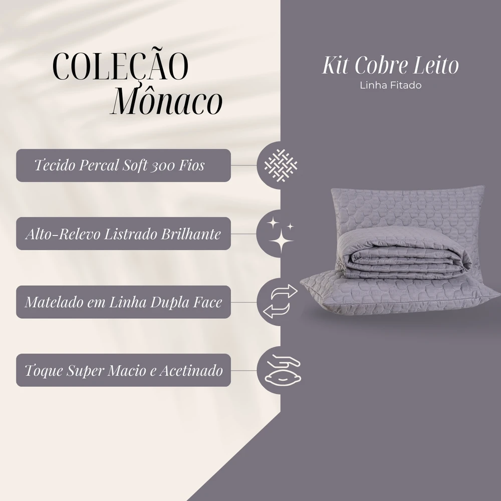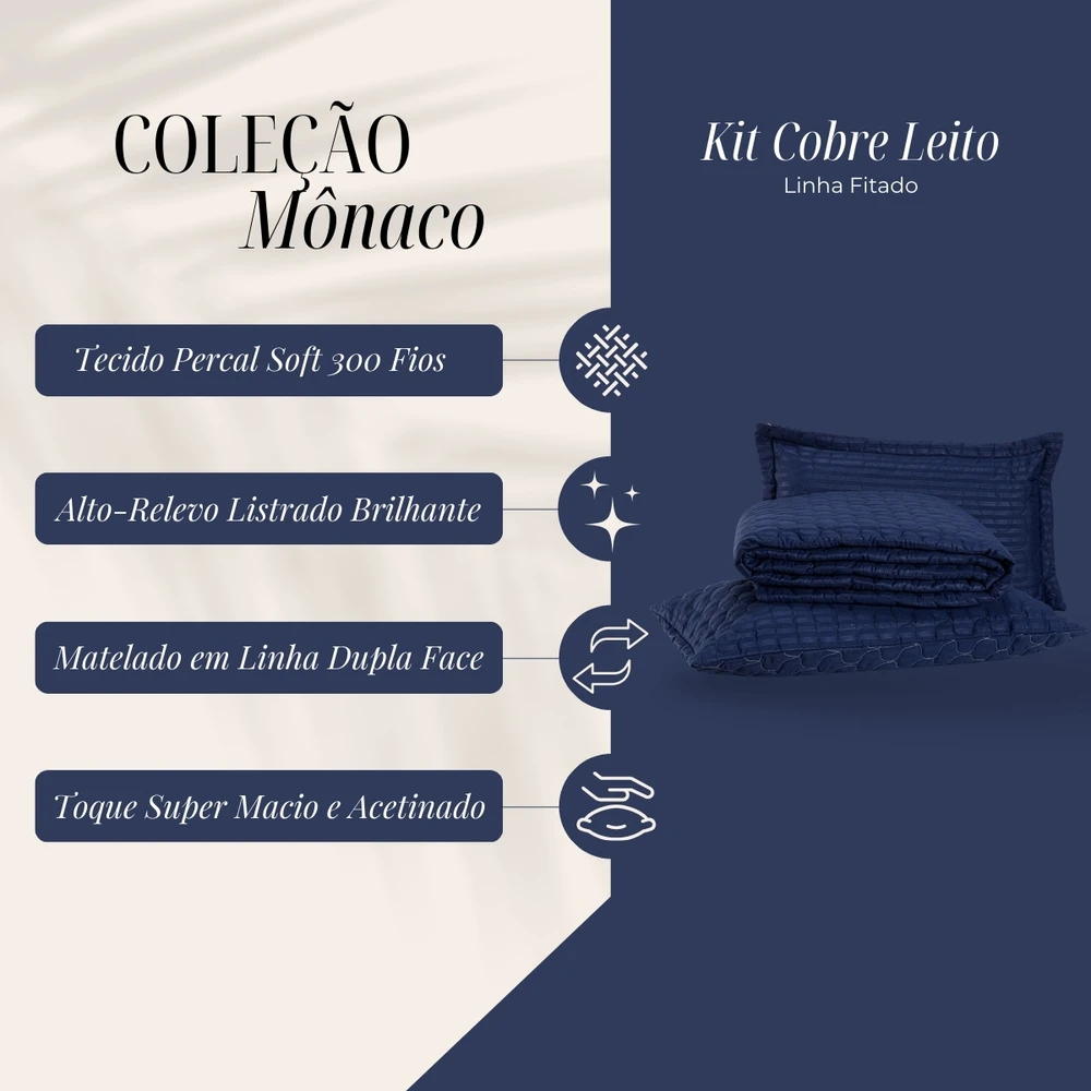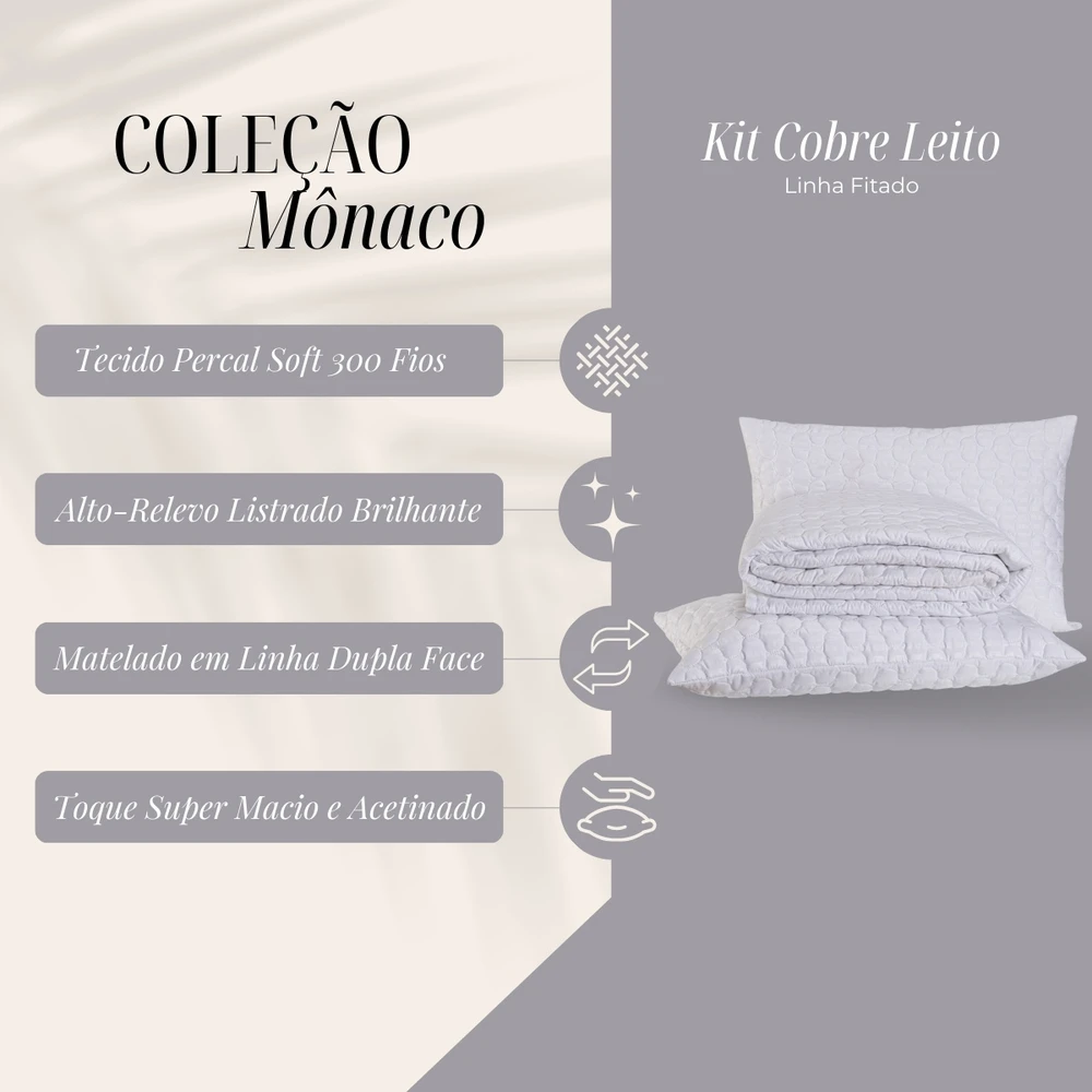 O Kit Cobre Leito Mônaco em Tecido Fitado Percal 300 Fios é a escolha perfeita para quem busca conforto, sofisticação e praticidade. Composto por três peças, sendo um cobreleito e duas fronhas, este kit proporciona um toque acetinado, garantindo uma sensação suave e agradável. A textura do percal soft em 300 fios combina resistência e maciez, proporcionando noites de sono de qualidade. O design dupla face matelado oferece versatilidade para compor diferentes estilos de decoração, com linhas em alto relevo brilhante, adaptando-se facilmente aos diversos ambientes. A escolha do tecido fitado confere um acabamento impecável, enquanto as listras discretas no tecido dão um toque de elegância e modernidade. Perfeito para transformar o visual do seu quarto, o Kit Cobre Leito Mônaco oferece não apenas beleza, mas também funcionalidade e durabilidade, sendo ideal para quem aprecia o conforto de um bom descanso. Confira!