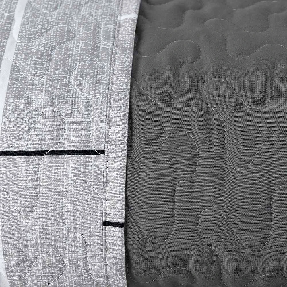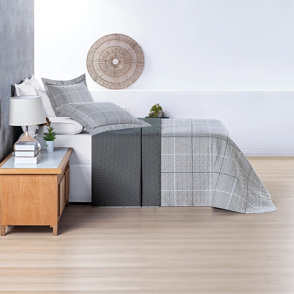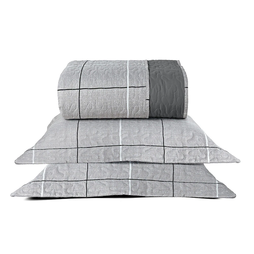 Kit Cobre Leito Colcha Celi Casal Padrão Dupla Face Micropercal 200 Fios 3 Peças Xadrez Grid Cinza