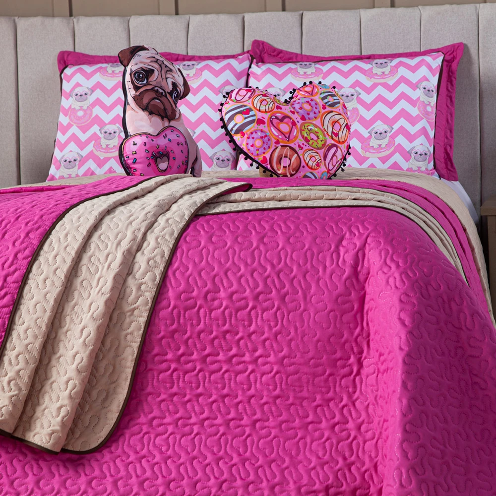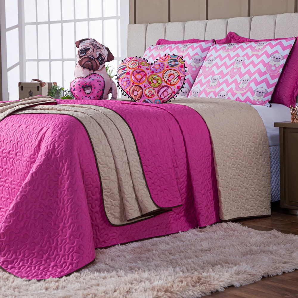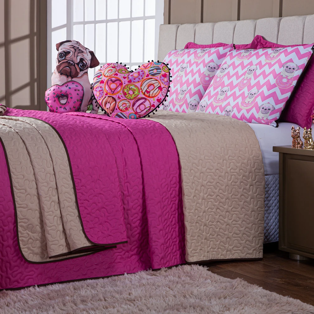 A Nova Coleção Donuts em Microfibra tem um toque suave e macio. O tecido caracteriza-se por ser muito leve, confortável, sedoso, com secagem rápida e ótimo caimento. Vem trazendo estilo para a decoração de seu quarto na nova tendência Dupla Face, podendo utilizar as 2 cores do cobre leito! Ficará de ótimo bom gosto e elegância. Acompanhando também uma almofadinha estampada temática com lindos detalhes em PomPom em toda a volta, junto com uma em formato de Doguinho super fofa! Tudo para combinar com o seu Kit! Confira!