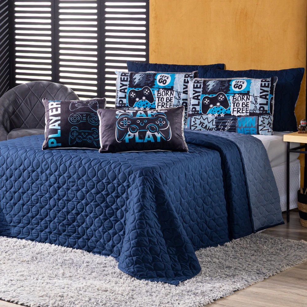 O Kit Cobre Leito Best Player é a escolha ideal para quem ama o universo gamer e quer levar estilo e conforto para o quarto. Produzido em tecido Percal de 300 fios, possui toque acetinado e super macio, garantindo noites mais aconchegantes. O design é inspirado na cultura dos games, com estampas de controles, frases temáticas e elementos gamer que deixam o ambiente moderno e cheio de personalidade. O cobre leito é dupla face, com costura em matelassê que forma desenhos em linha e um acabamento sofisticado. O kit é composto por 1 cobre leito dupla face, 2 porta-travesseiros matelados, 2 porta-travesseiros estampados com viés, 1 capa de almofada quadrada estampada e 1 almofada cheia retangular estampada com viés, totalizando as 7 peças que unem beleza e conforto em um só conjunto. Confira!