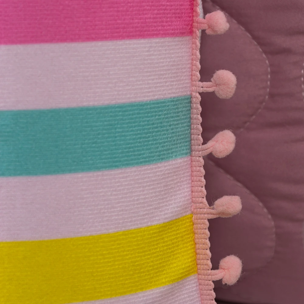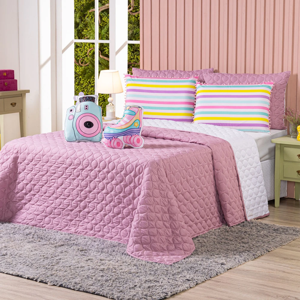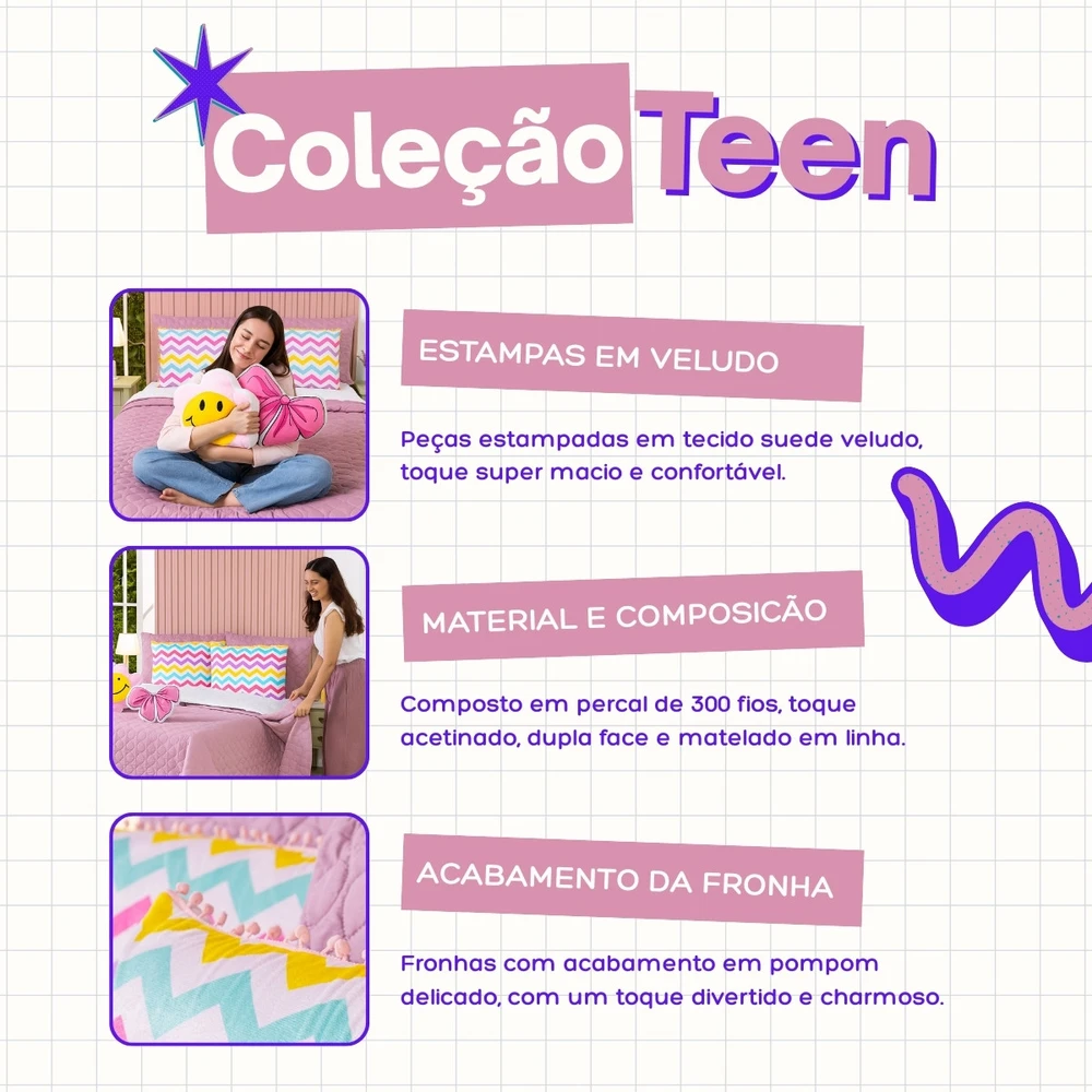 Conforto e estilo com a Coleção Teen! Cobre Leito dupla face em Percal 300 fios com enchimento macio, matelado geométrico moderno em linha e fronhas estampadas em veludo suede com pompom delicado, acompanhando também 2 almofadas animadas estampadas com elementos divertidos do mundo teen, deixando a decoração cheia de charme. Ideal para quem busca aconchego e personalidade!