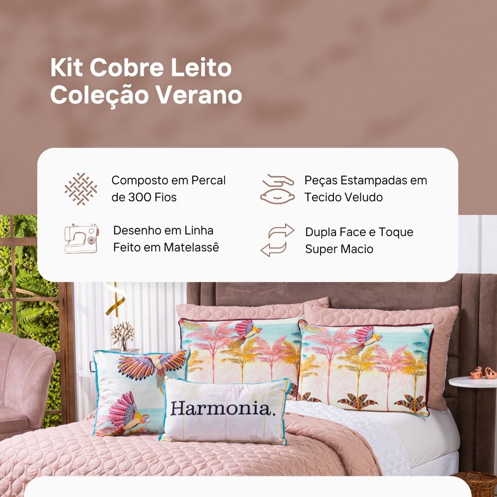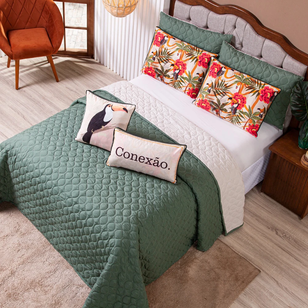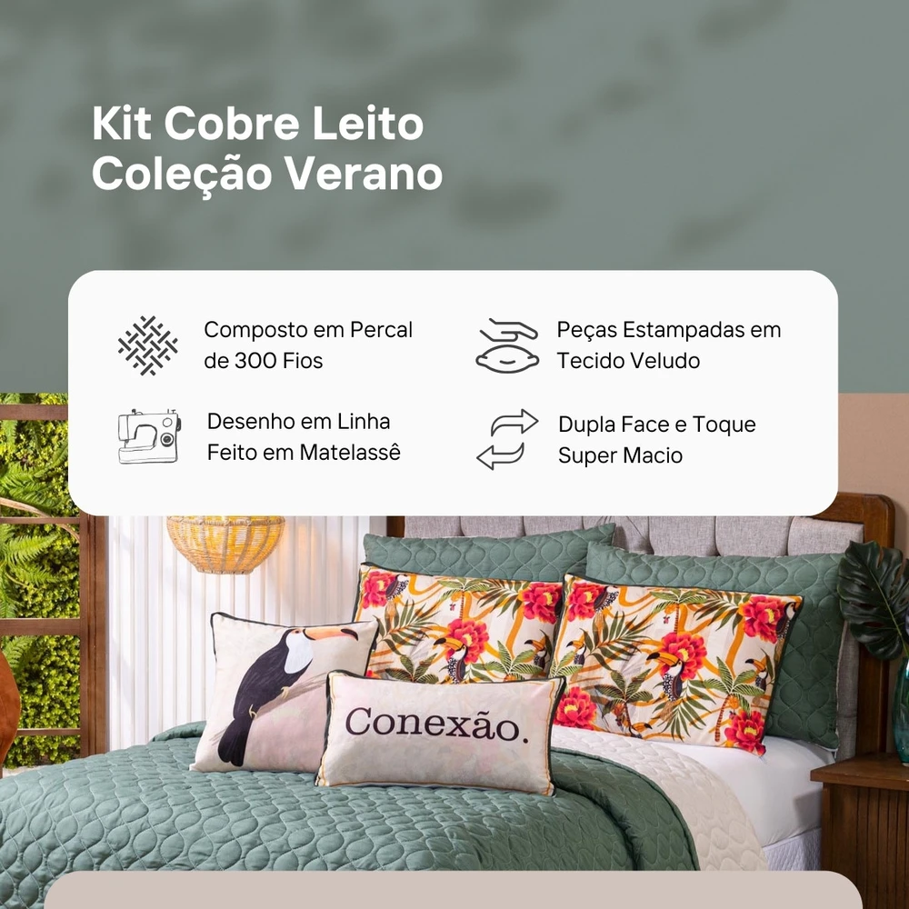 O Kit Verano é a escolha ideal para quem deseja transformar o quarto em um espaço cheio de vida e aconchego. Inspirado na beleza da natureza, ele traz estampas vibrantes que remetem à floresta, com animais, flores e plantas em cores intensas que deixam o ambiente mais alegre e acolhedor. Produzido em percal poliéster de 300 fios, o tecido oferece um toque super macio e agradável, enquanto o enchimento alto e volumoso garante noites de sono mais confortáveis. O cobre leito é dupla face e conta com acabamento de linha em matelassê, que valoriza ainda mais o design e confere um detalhe sofisticado à peça. Para completar, o kit acompanha fronhas lisas e estampadas, além de almofadas temáticas que dão um charme e trazem uma mensagem especial à decoração, criando um conjunto prático, elegante e cheio de estilo para o dia a dia.