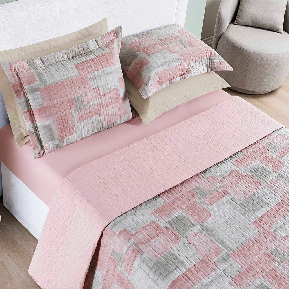 Kit Cobre Leito Colcha Maris Casal Padrão Estampado Dupla Face Percalle 200 Fios 3 Peças Quadri Rosê