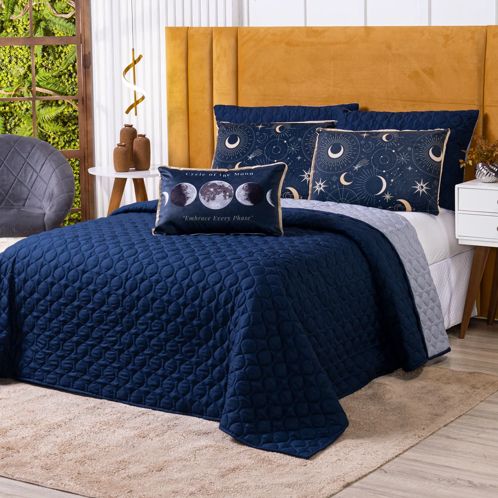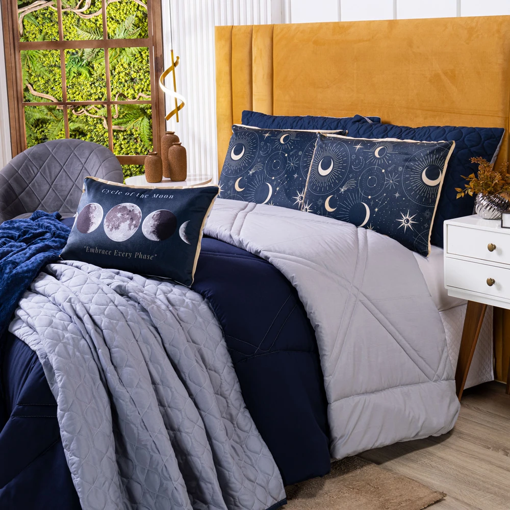 Transforme seu quarto em um verdadeiro universo de conforto e estilo com o Kit Cobre Leito Astros. Confeccionado em Percal de 300 fios, possui toque acetinado, super macio e aconchegante, garantindo noites de sono mais tranquilas. O kit é totalmente temático, trazendo estampas inspiradas em luas, fases da lua, astros e elementos de astronomia, perfeito para quem ama o encanto do espaço sideral. O cobre leito dupla face conta com costura desenhada em linha matelada, que adiciona elegância e sofisticação ao acabamento. Já os porta-travesseiros possuem detalhes em debrum e viés, reforçando a delicadeza do conjunto. A almofada retangular estampada complementa a composição, trazendo um charme extra para a decoração. Confira!