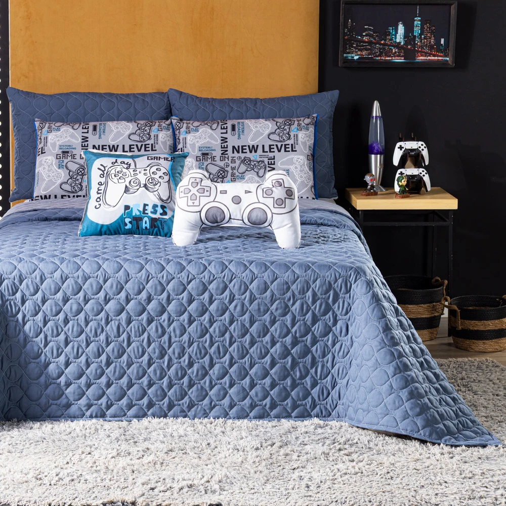 O Kit Cobre Leito Game Start é perfeito para quem ama o universo gamer e quer levar esse estilo para a decoração do quarto. Confeccionado em Percal 300 Fios Dupla Face, o cobre leito oferece toque super macio e acabamento impecável. O kit acompanha fronhas, capa de almofada com tema de videogame e uma almofada divertida em formato de controle, tudo estampado em um tecido de veludo com um toque incrível, deixando o ambiente moderno e descontraído. Ideal para crianças, jovens e adultos que respiram o mundo dos games e valorizam conforto aliado a design exclusivo. Confira!