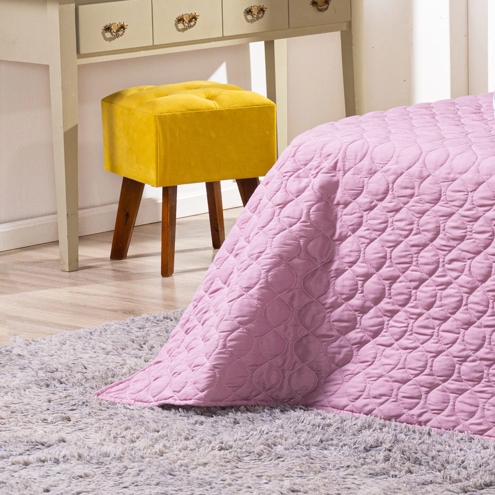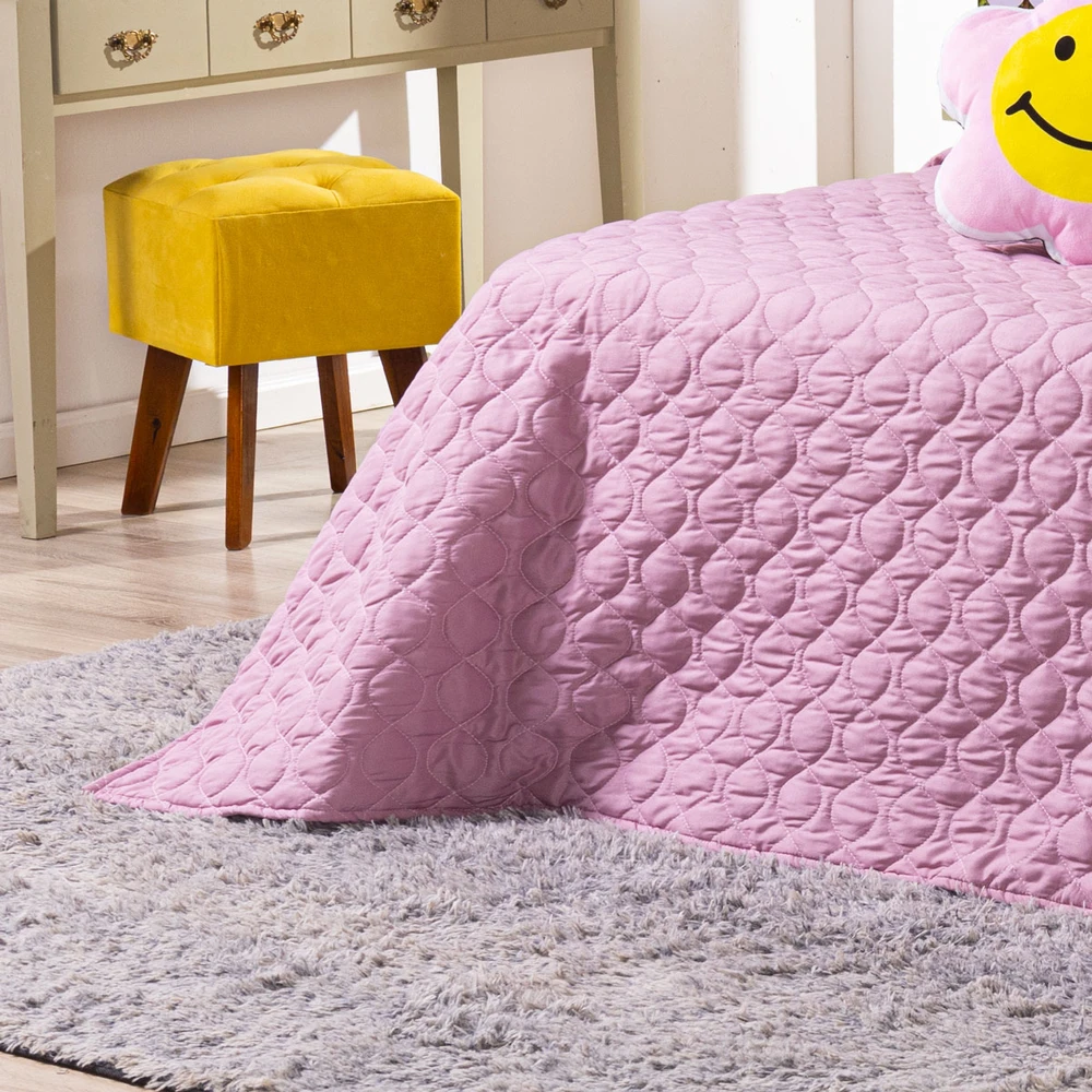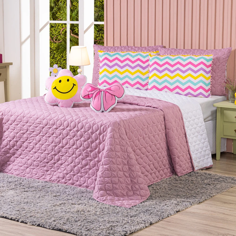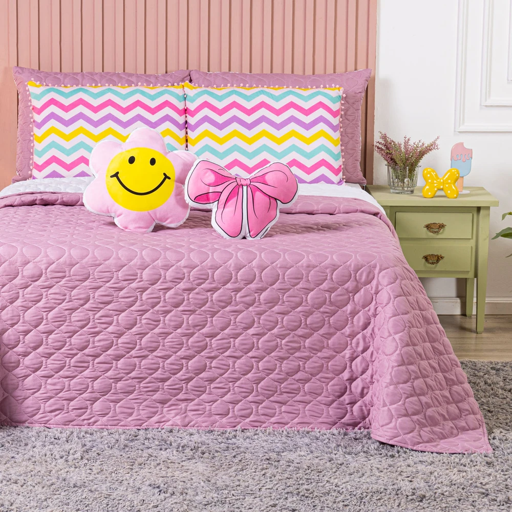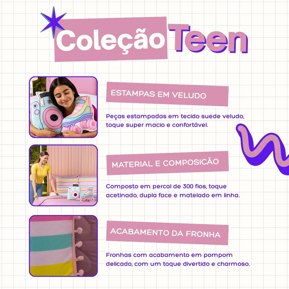 Conforto e estilo com a Coleção Teen! Cobre Leito dupla face em Percal 300 fios com enchimento macio, matelado geométrico moderno em linha e fronhas estampadas em veludo suede com pompom delicado, acompanhando também 2 almofadas animadas estampadas com elementos divertidos do mundo teen, deixando a decoração cheia de charme. Ideal para quem busca aconchego e personalidade!