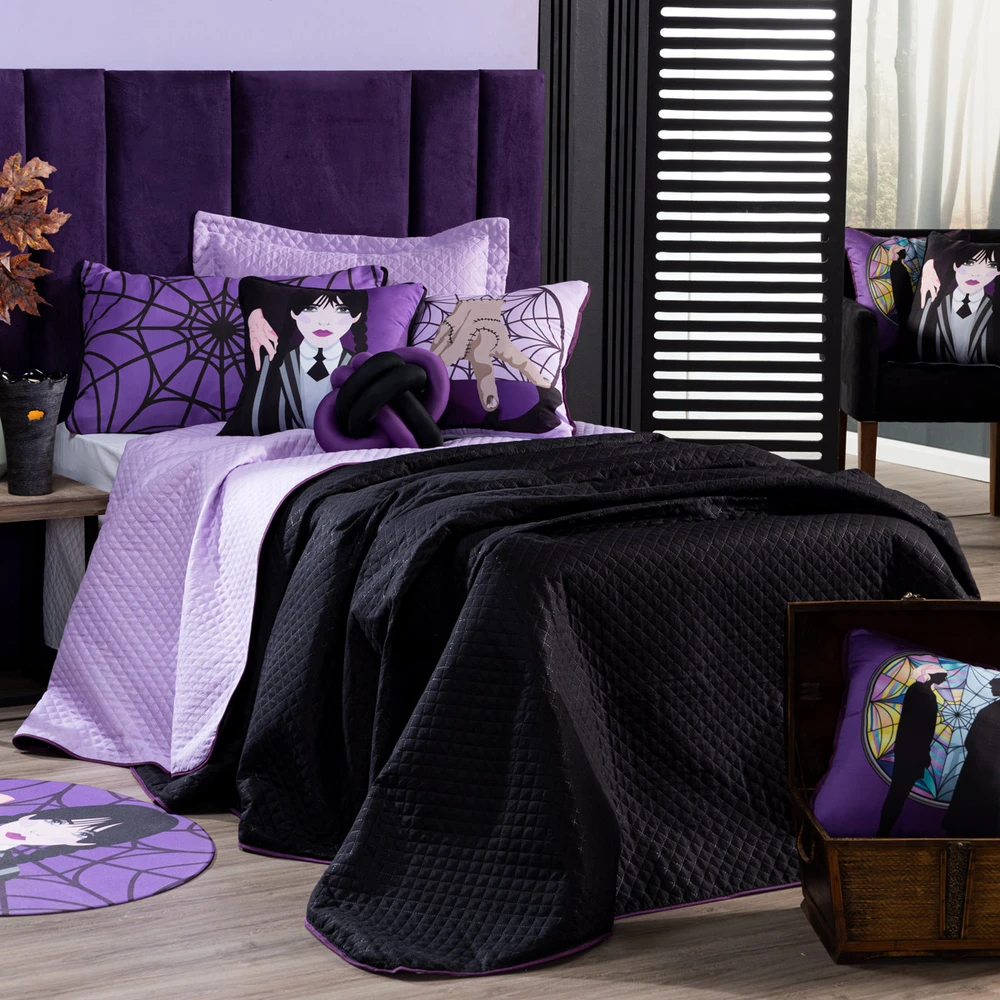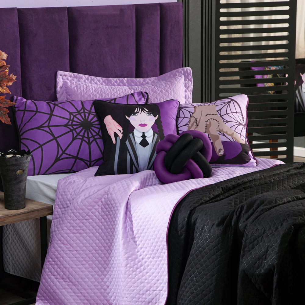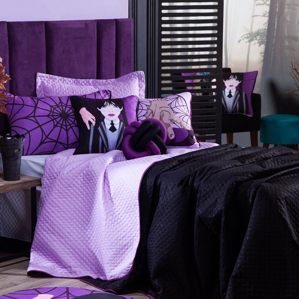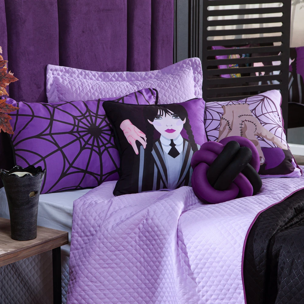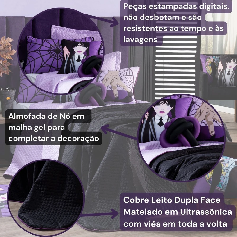Nova tendência no mundo dos filmes e seriados, lançamos um novo kit temático da Wandinha! A Nova Coleção Wandinha com o Cobre Leito em Microfibra tem um toque suave e macio, o tecido caracteriza-se por ser muito leve, confortável, sedoso, com secagem rápida e ótimo caimento. Vem trazendo estilo para a decoração de seu quarto em Dupla Face, podendo utilizar as 2 cores do cobre leito! Ficará de ótimo bom gosto e elegância, acompanhando porta-travesseiro, almofada de nó em duas cores e duas capinhas de almofadas estampadas super modernas e temáticas! Tudo para combinar com a decoração, perfeito para renovar o ambiente ou para presentear quem você ama! Confira!
