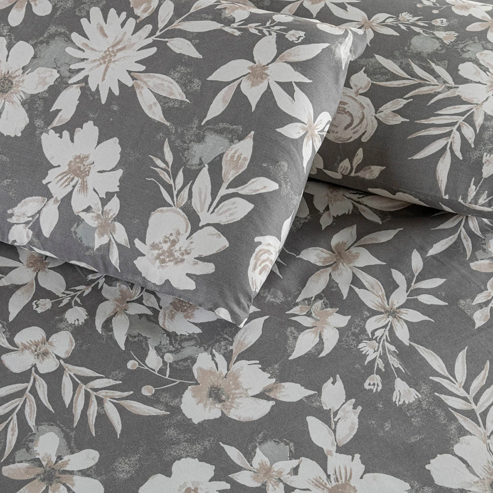 Kit Cobre Leito Colcha Turin Casal Estampada c/ Babado 400 Fios 3 Peças Florido Flores Cinza - 100% Poliéster