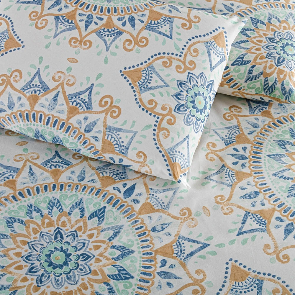 Kit Cobre Leito Colcha Turin Casal Estampada c/ Babado 400 Fios 3 Peças Mandala Azul Bege - 100% Poliéster