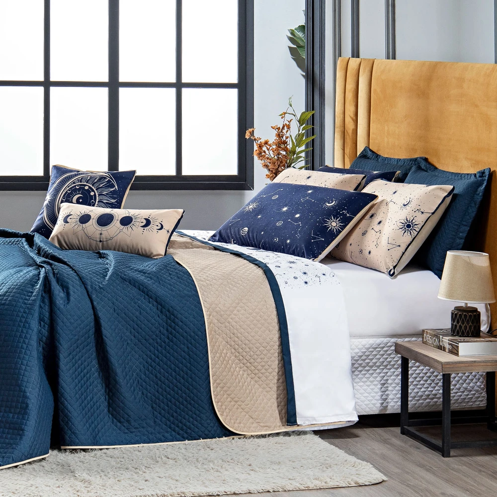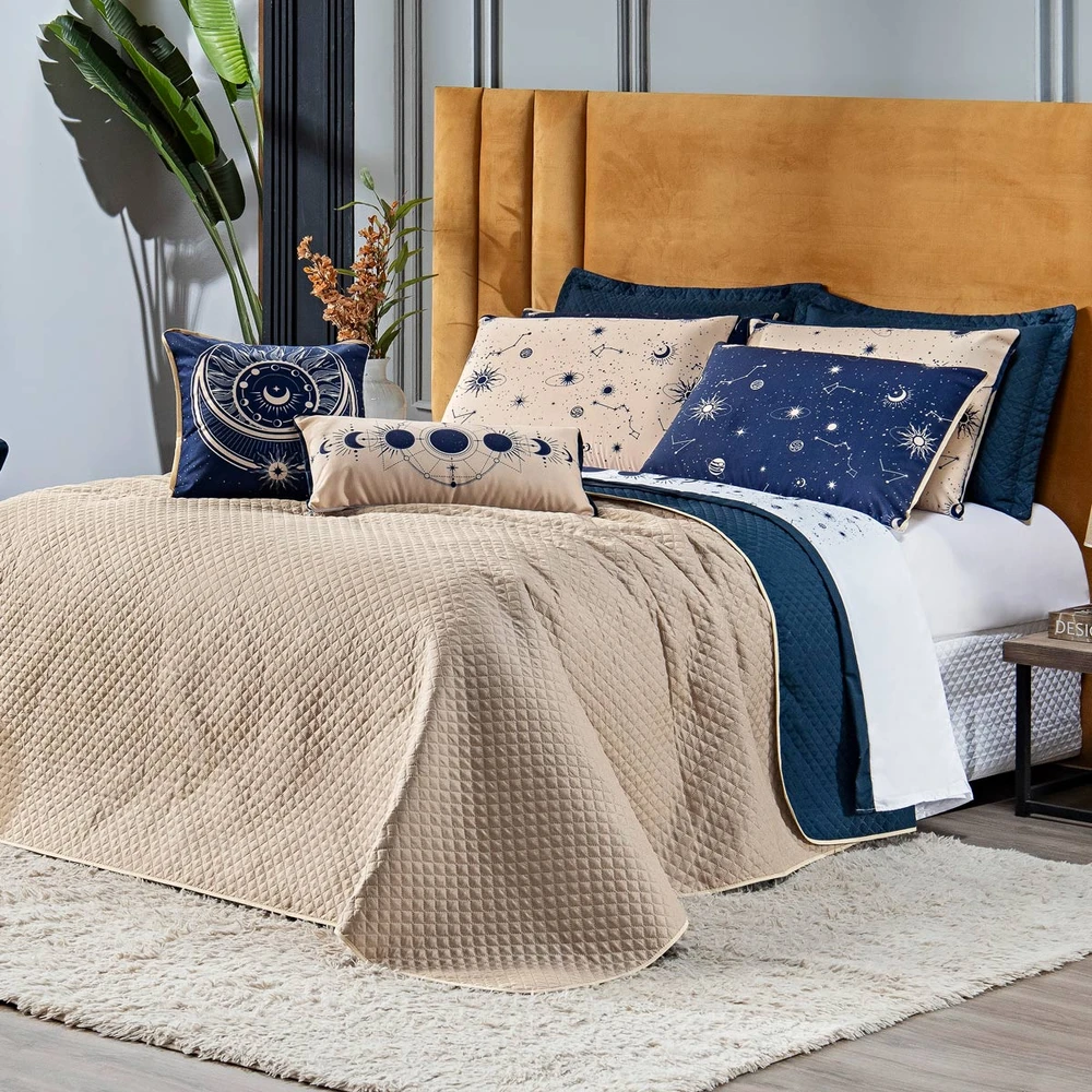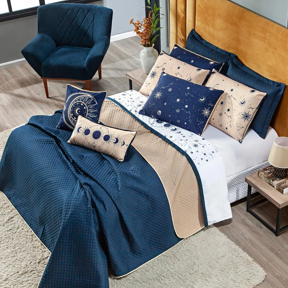 Transforme seu quarto em um verdadeiro universo de beleza e conforto com o nosso Kit Cobre Leito Constelações! Este conjunto é um convite para uma jornada celestial em meio aos seus momentos de descanso. Inspirado no mistério das constelações e na magia da astrologia, as cores em tons de azul e caqui evocam uma sensação de tranquilidade e elegância. E a melhor parte? É dupla face! Assim, você pode escolher entre dois estilos distintos para renovar a aparência do seu quarto sempre que desejar. Este kit não é apenas uma peça de decoração, mas sim uma experiência completa de conforto. Feito com materiais de qualidade, o cobre leito é macio ao toque e proporciona aconchego para todos os dias. As peças estampadas em tecido veludo suede complementam o conjunto, adicionando um toque final de sofisticação e praticidade. Adquira agora este Kit e transforme o seu quarto em um refúgio celestial de conforto e estilo. Confira!