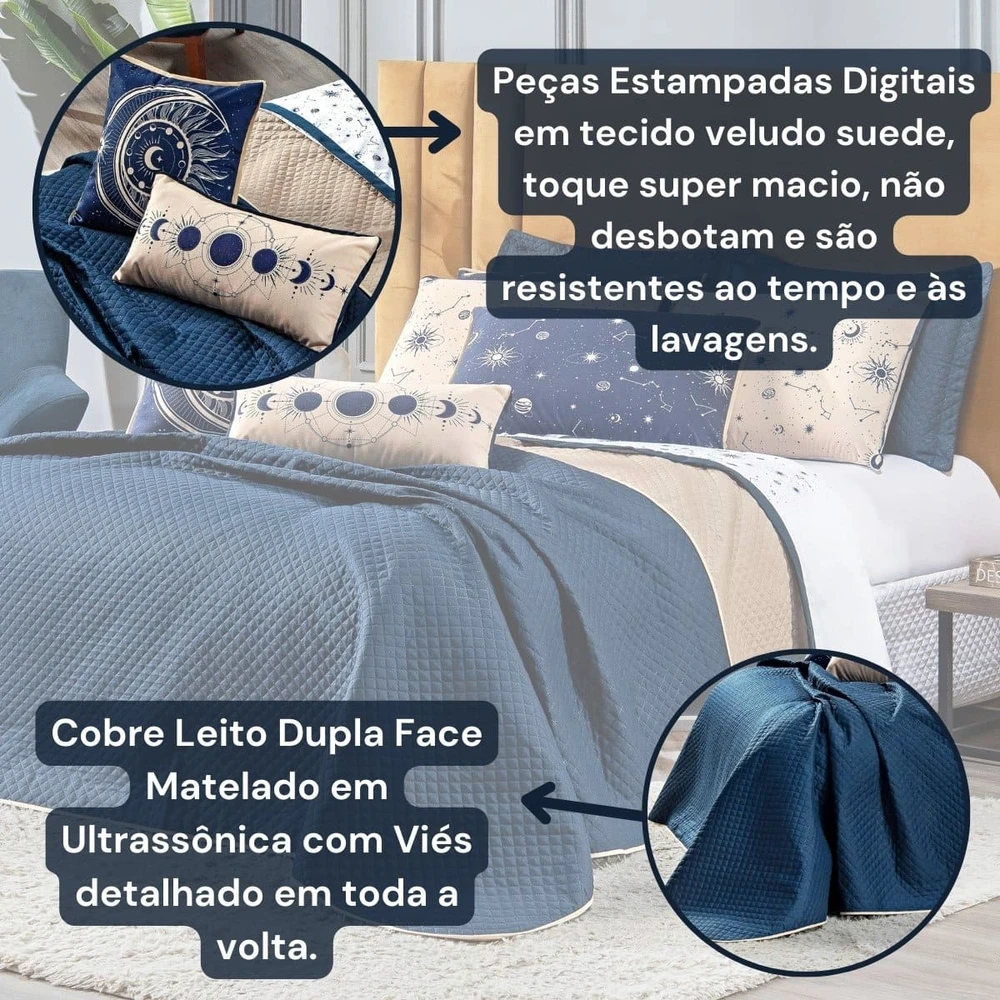 Transforme seu quarto em um verdadeiro universo de beleza e conforto com o nosso Kit Cobre Leito Constelações! Este conjunto é um convite para uma jornada celestial em meio aos seus momentos de descanso. Inspirado no mistério das constelações e na magia da astrologia, as cores em tons de azul e caqui evocam uma sensação de tranquilidade e elegância. E a melhor parte? É dupla face! Assim, você pode escolher entre dois estilos distintos para renovar a aparência do seu quarto sempre que desejar. Este kit não é apenas uma peça de decoração, mas sim uma experiência completa de conforto. Feito com materiais de qualidade, o cobre leito é macio ao toque e proporciona aconchego para todos os dias. As peças estampadas em tecido veludo suede complementam o conjunto, adicionando um toque final de sofisticação e praticidade. Adquira agora este Kit e transforme o seu quarto em um refúgio celestial de conforto e estilo. Confira!