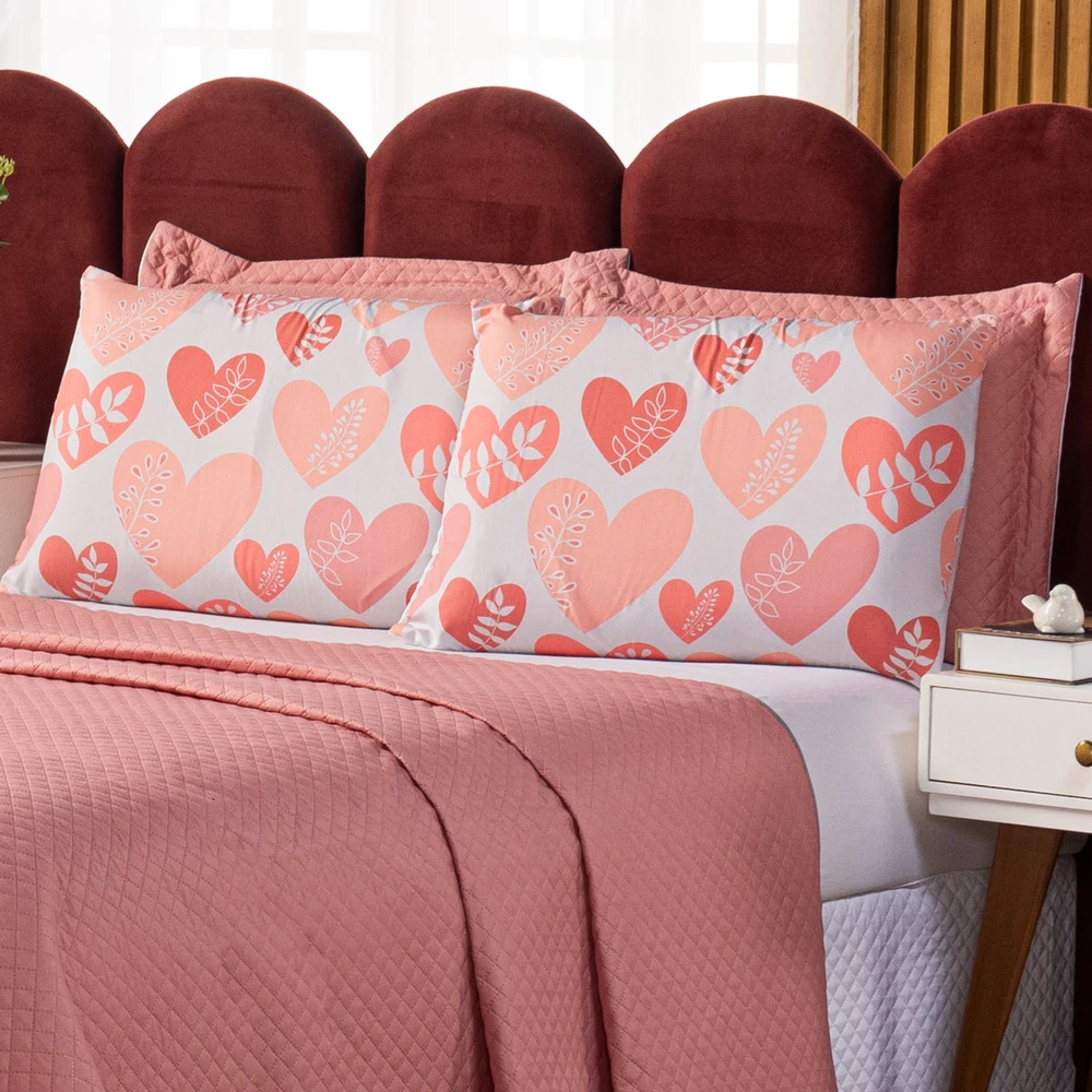 O Kit Cobre Leito Corações é a escolha perfeita para dar um toque de romance e elegância ao seu quarto. Este conjunto é dupla face, oferecendo versatilidade com um lado em rosê suave e outro em branco puro, permitindo que você escolha o visual que mais combina com o seu estado de espírito. O kit inclui duas fronhas estampadas e duas mateladas que complementam o design, adicionando um toque de delicadeza e charme ao conjunto. Especificamente projetado para camas de casal padrão, este conjunto é a maneira ideal de transformar o seu quarto em um ambiente aconchegante e romântico. Perfeito para casais que desejam um espaço que reflita seu amor e paixão, com toques de doçura e ternura através dos corações no design. Confira!