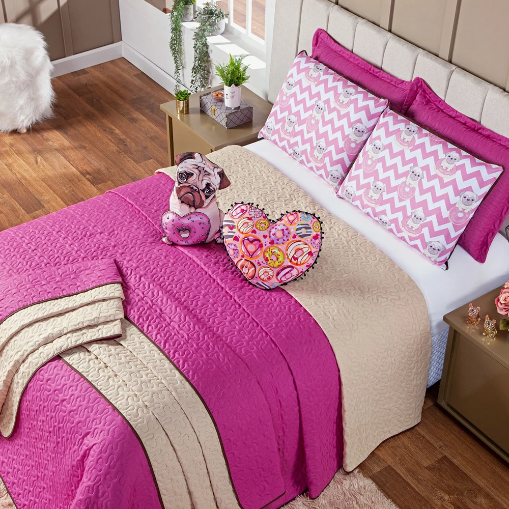 A Nova Coleção Donuts em Microfibra tem um toque suave e macio. O tecido caracteriza-se por ser muito leve, confortável, sedoso, com secagem rápida e ótimo caimento. Vem trazendo estilo para a decoração de seu quarto na nova tendência Dupla Face, podendo utilizar as 2 cores do cobre leito! Ficará de ótimo bom gosto e elegância. Acompanhando também uma almofadinha estampada temática com lindos detalhes em PomPom em toda a volta, junto com uma em formato de Doguinho super fofa! Tudo para combinar com o seu Kit! Confira!