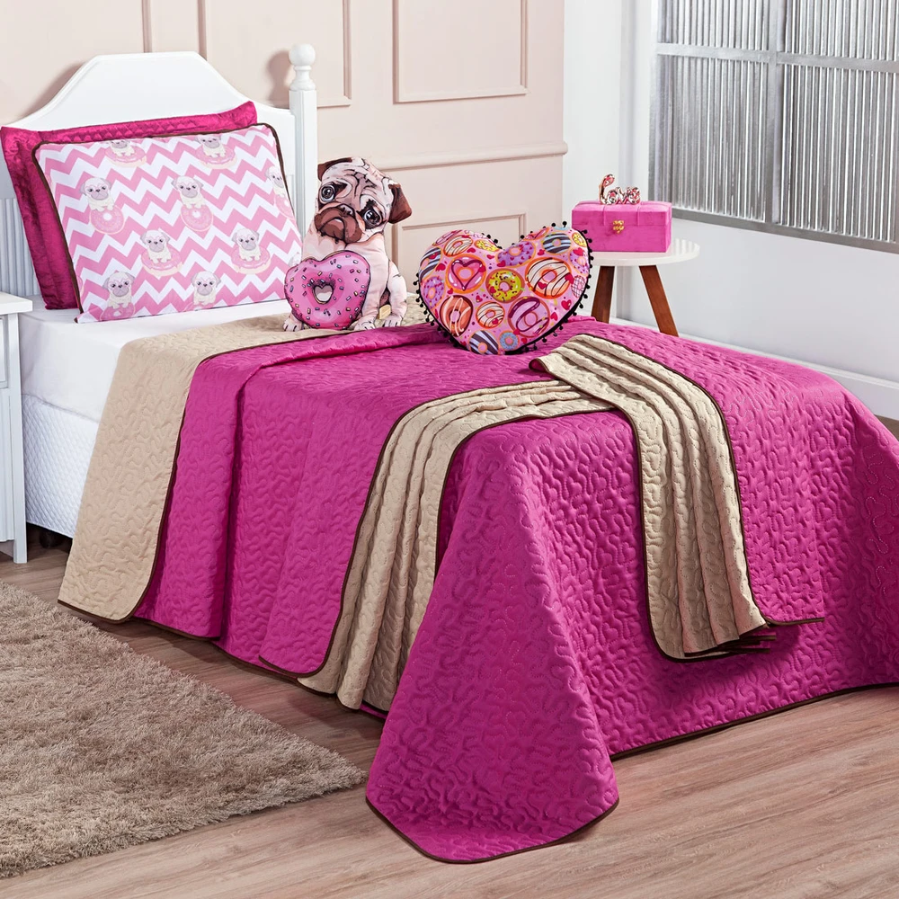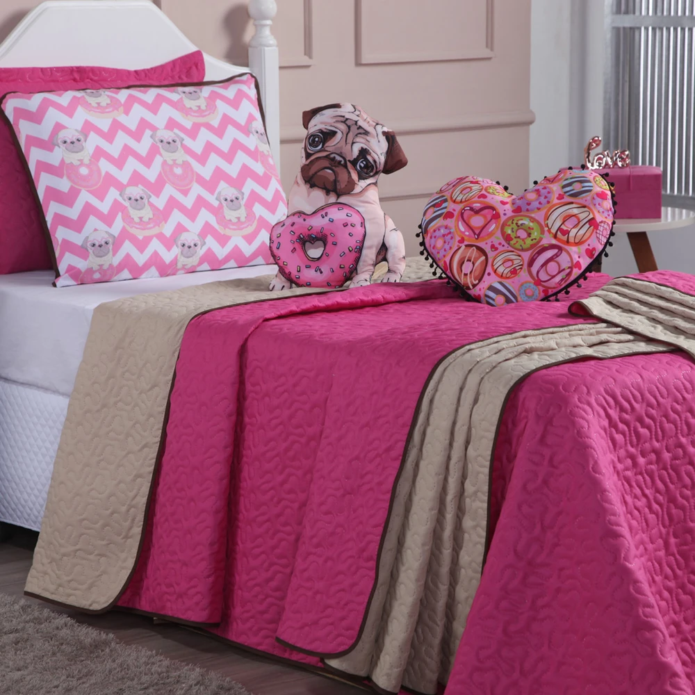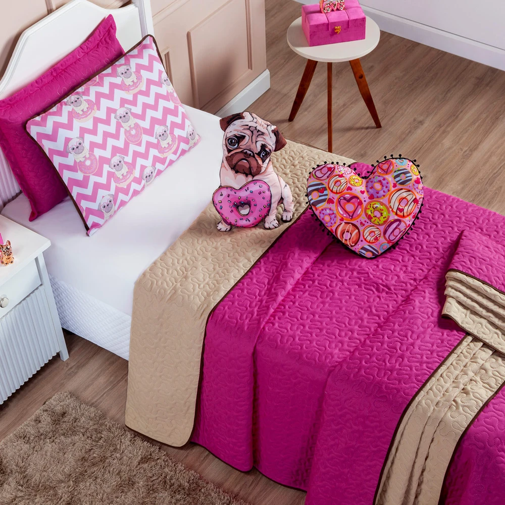 A Nova Coleção Donuts em Microfibra tem um toque suave e macio. O tecido caracteriza-se por ser muito leve, confortável, sedoso, com secagem rápida e ótimo caimento. Vem trazendo estilo para a decoração de seu quarto na nova tendência Dupla Face, podendo utilizar as 2 cores do cobre leito! Ficará de ótimo bom gosto e elegância. Acompanhando também uma almofadinha estampada temática com lindos detalhes em PomPom em toda a volta, junto com uma em formato de Doguinho super fofa! Tudo para combinar com o seu Kit! Confira!