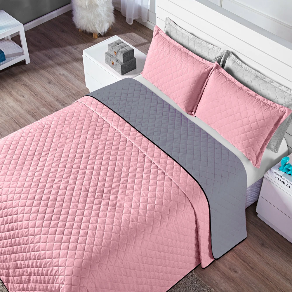 Kit Cobre Leito Dual Color Rosa/Cinza Casal Padrão 03 Peças - Dupla Face