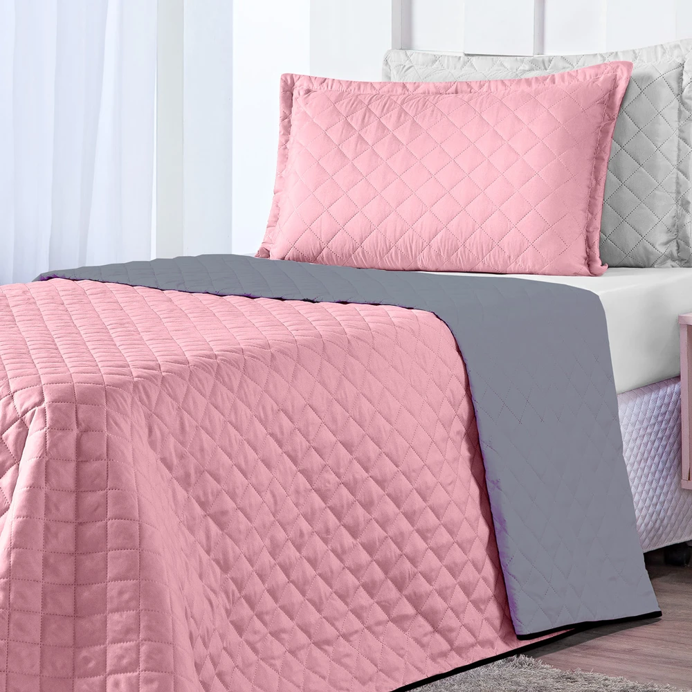 Kit Cobre Leito Dual Color Rosa/Cinza Solteiro 02 Peças - Dupla Face